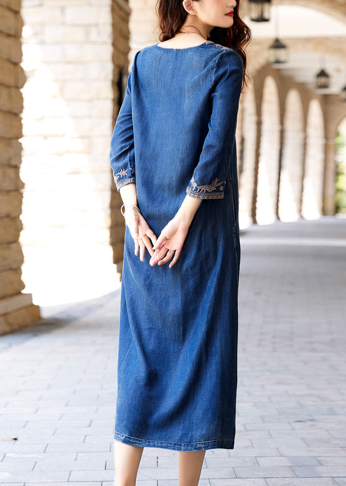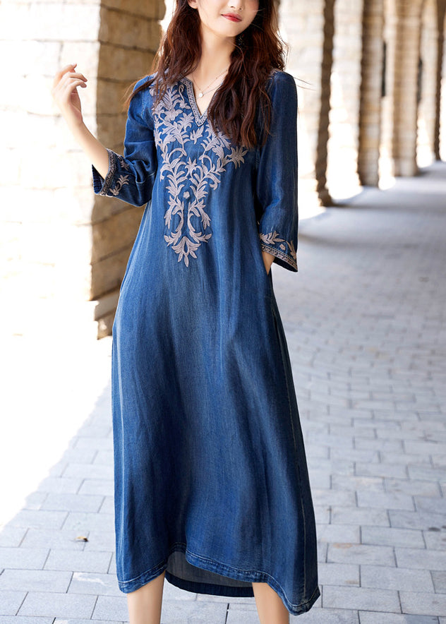 Handmade Blue V Neck Embroidered Silk Cotton Long Denim Dress Long Sleeve