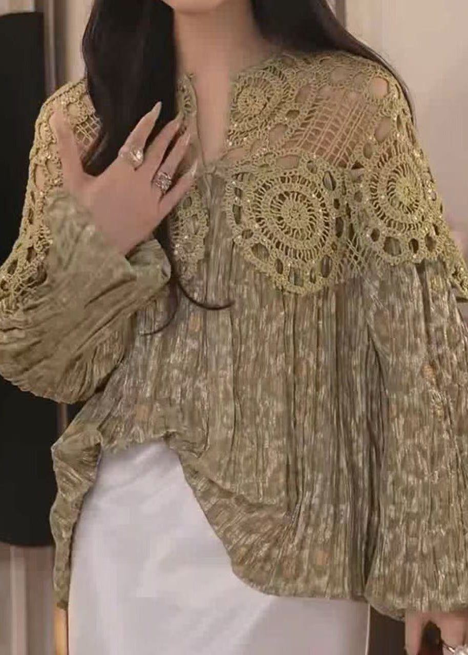 Beautiful Green V Neck Hollow Out Patchwork Cotton Shirt Fall