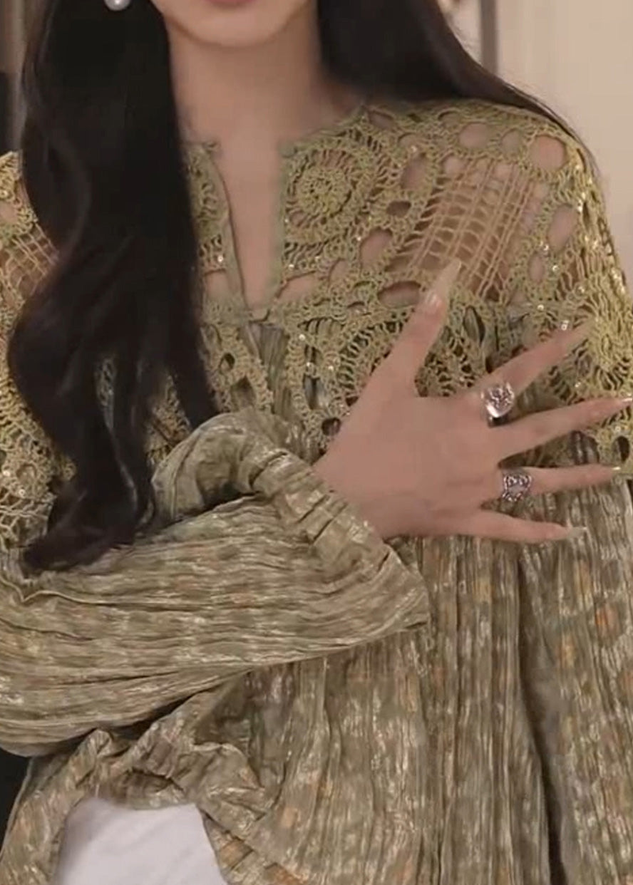 Beautiful Green Tasseled Print Patchwork Silk Tops Half Sleeve