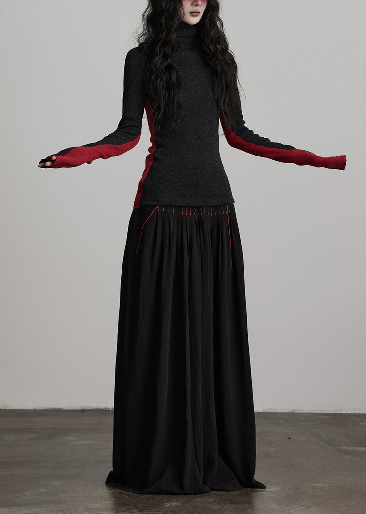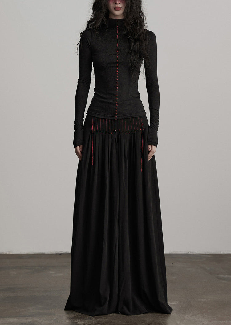 French Black Tasseled Draping Cotton Wide Leg Pants Spring