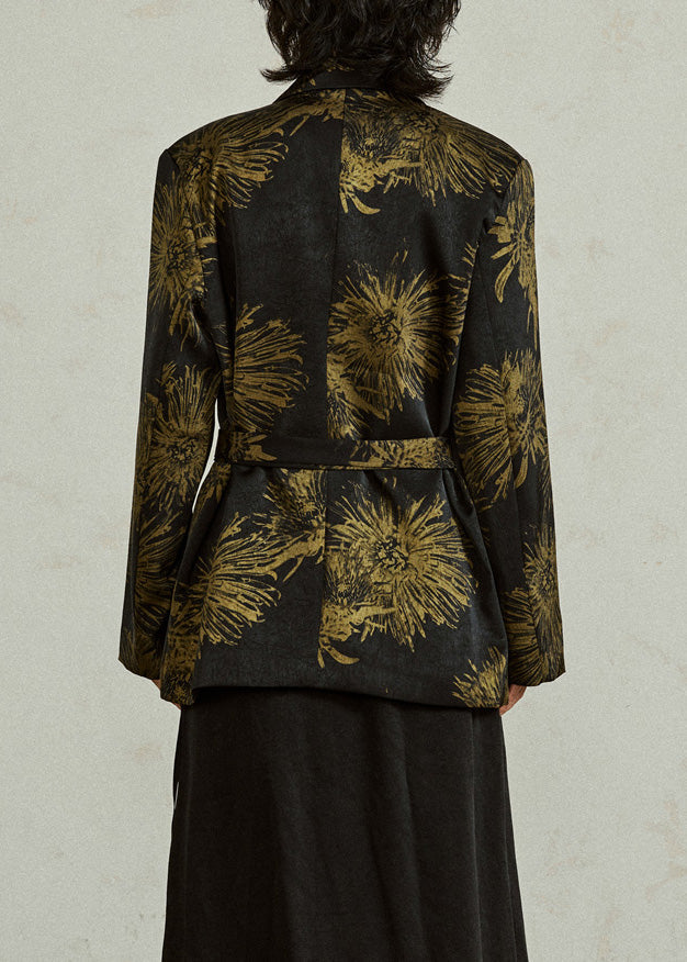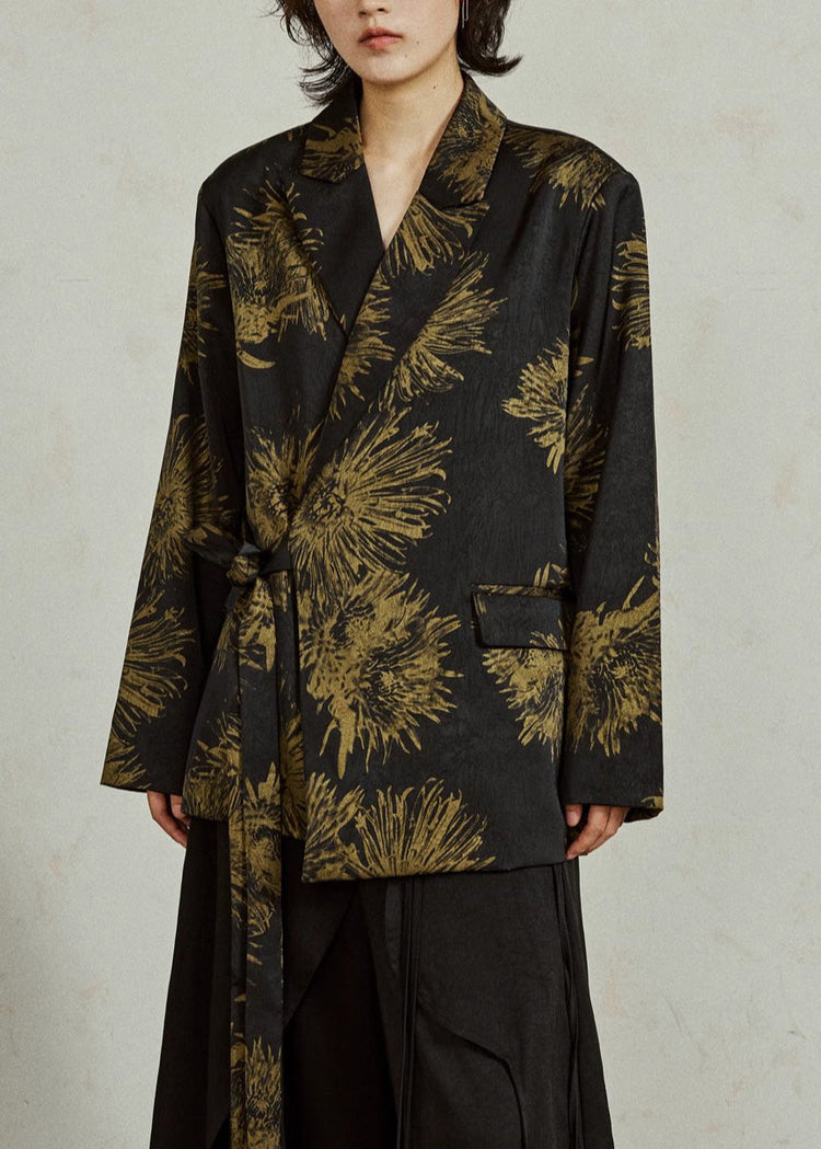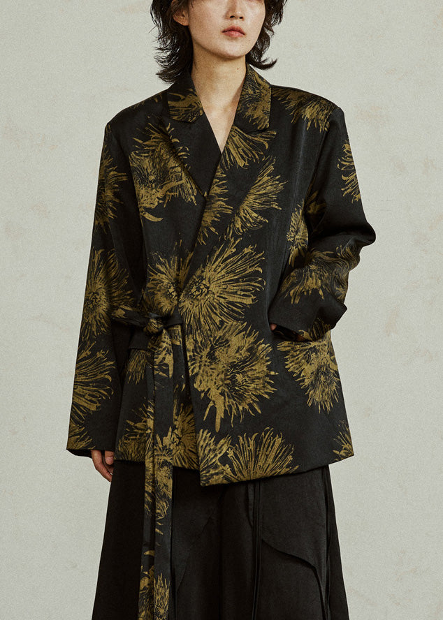 Chinese Style Black Notched Print Tie Waist Coats Fall