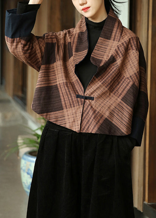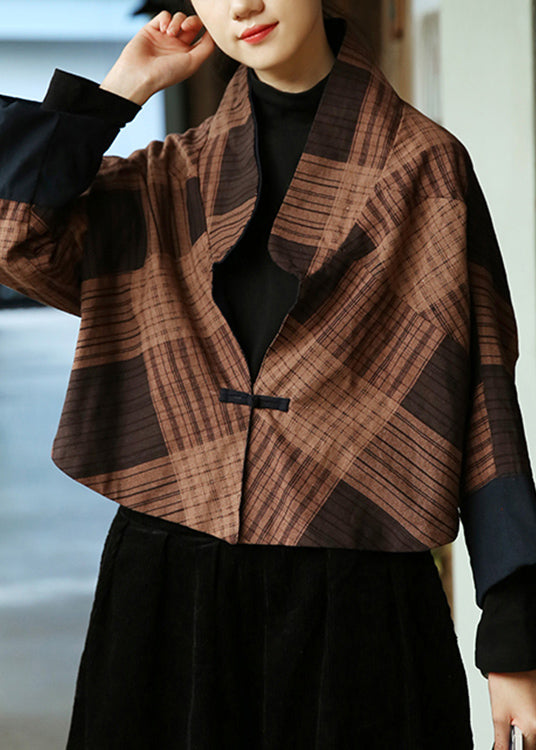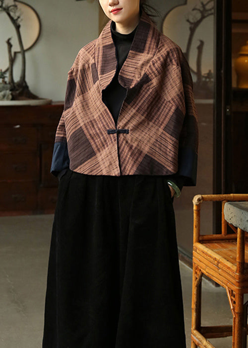 Coffee Button Patchwork Cotton Coat Stand Collar Long Sleeve