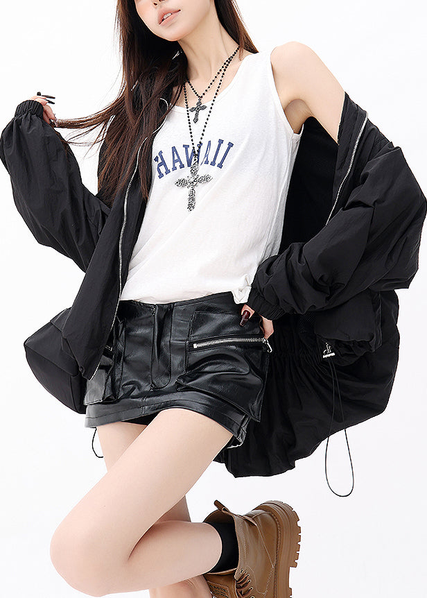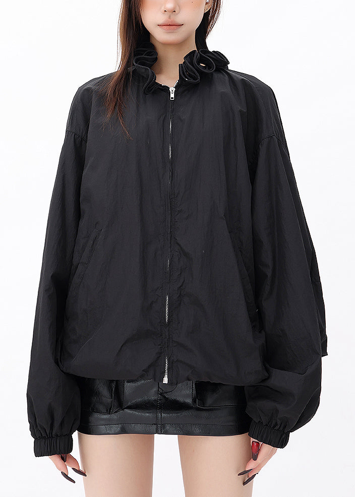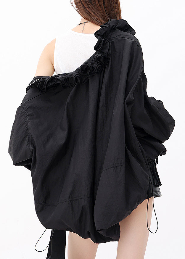 Fashion Black Ruffled Zip Up Drawstring Jacket Fall