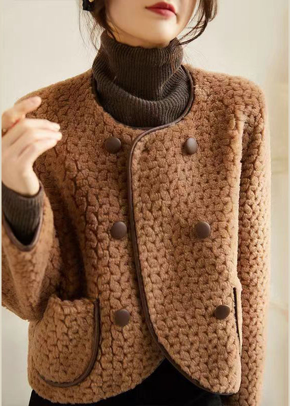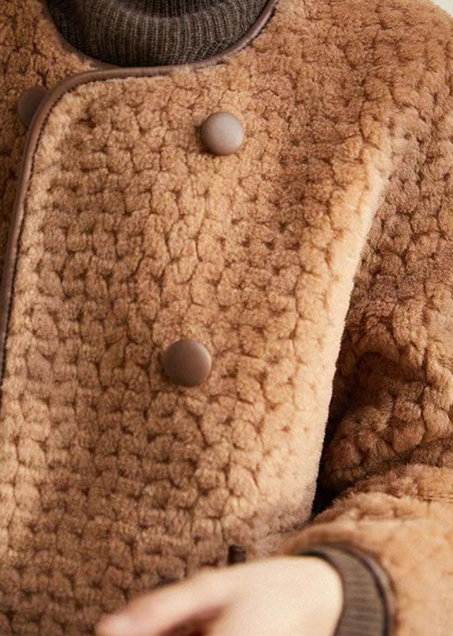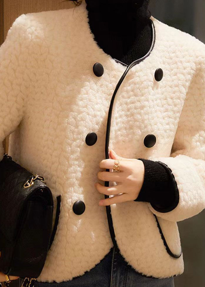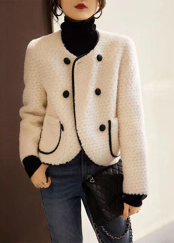 French Beige O Neck Pockets Patchwork Wool Coats Winter
