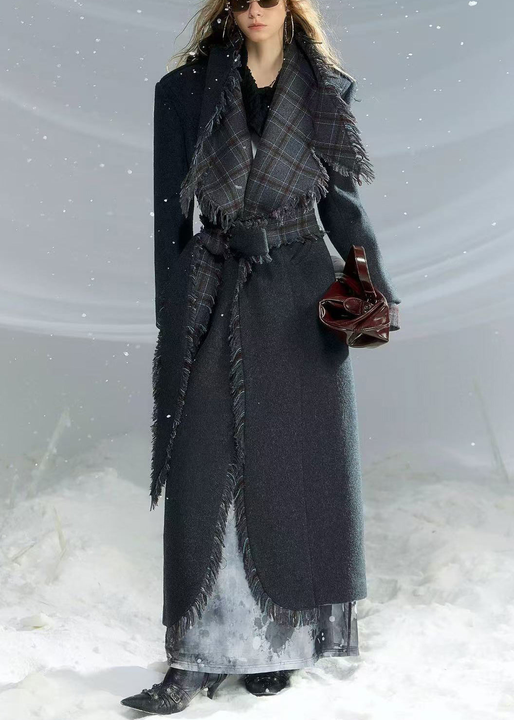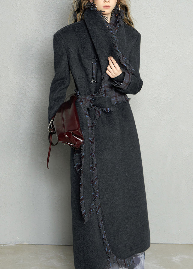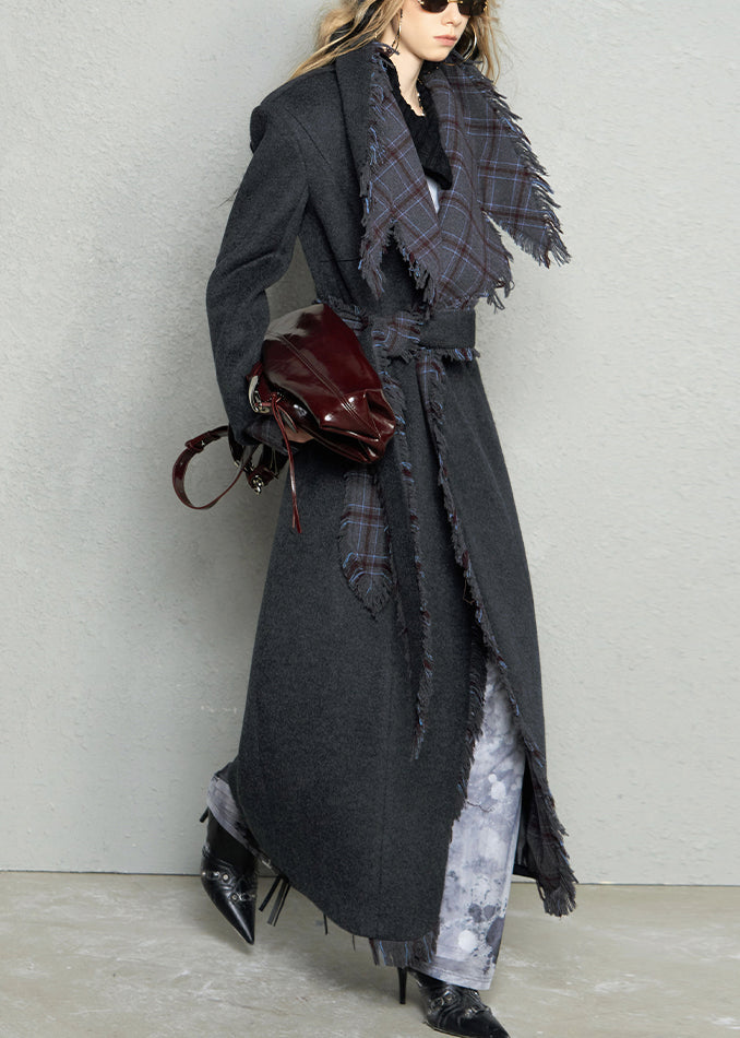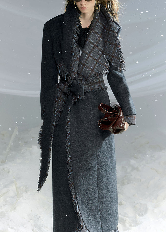 French Dark Gray Peter Pan Collar Plaid Woolen Long Coat Fall