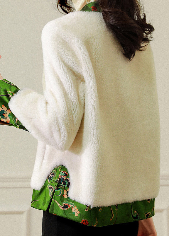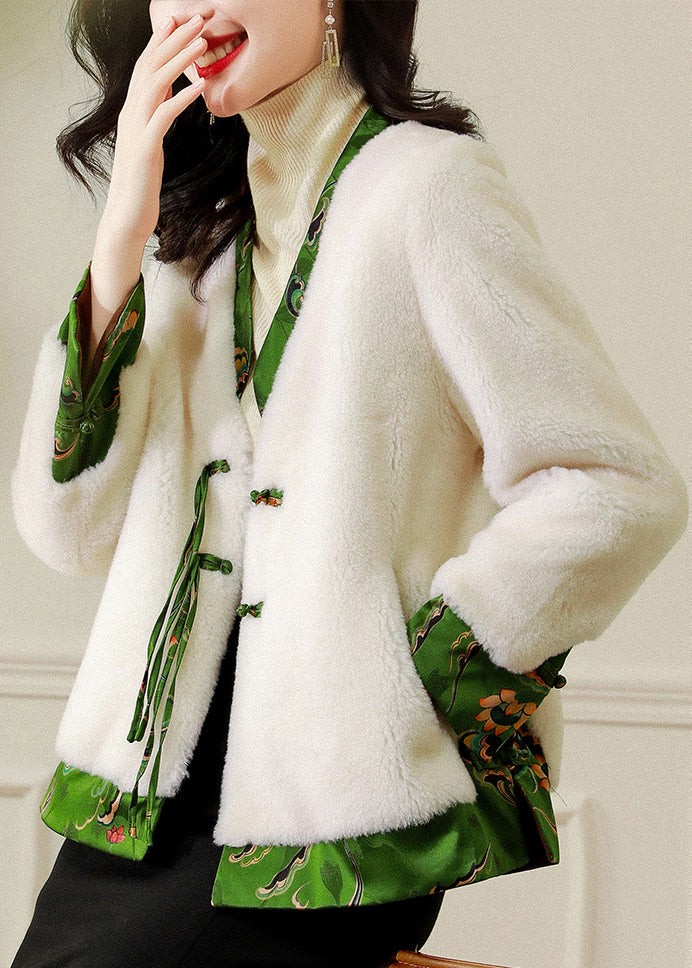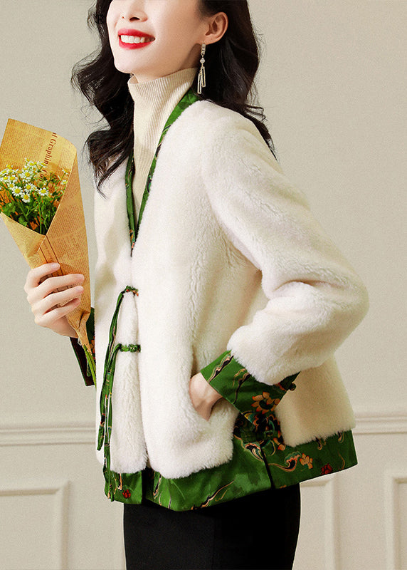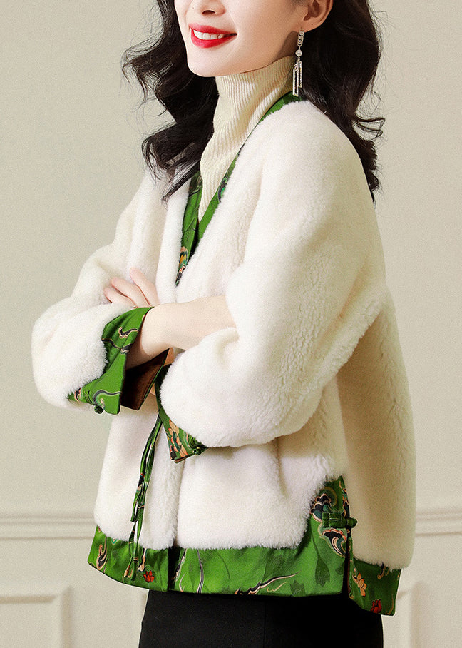 French White V Neck Tasseled Patchwork Wool Coat Winter