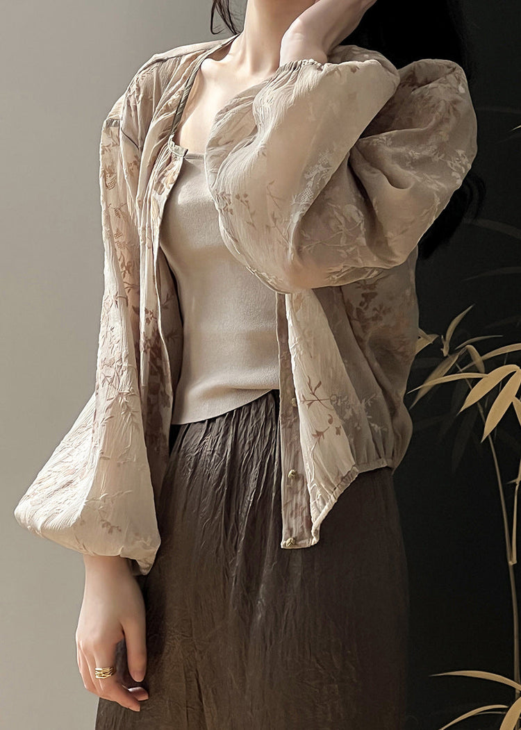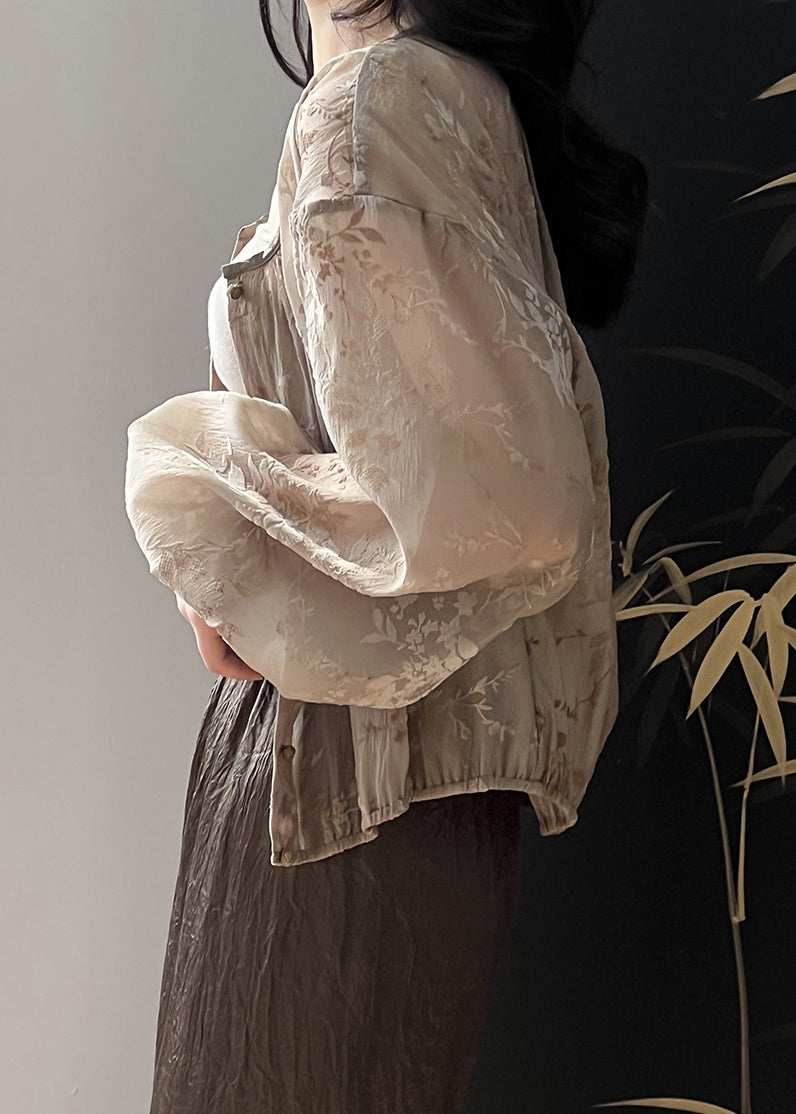 Jacquard Brown O Neck Button Coats Long Sleeve