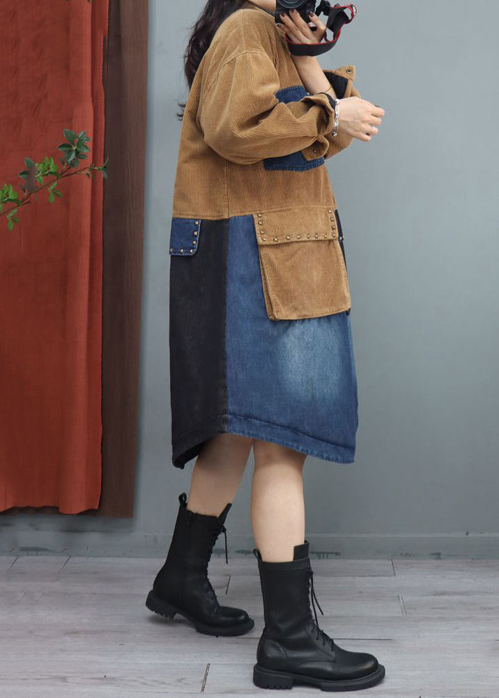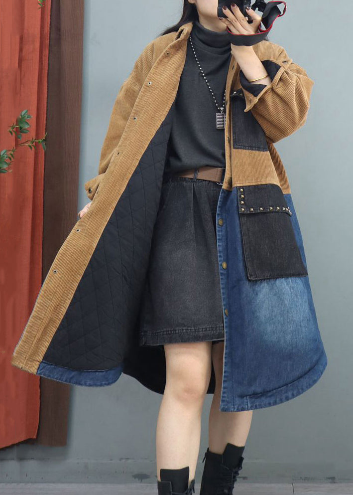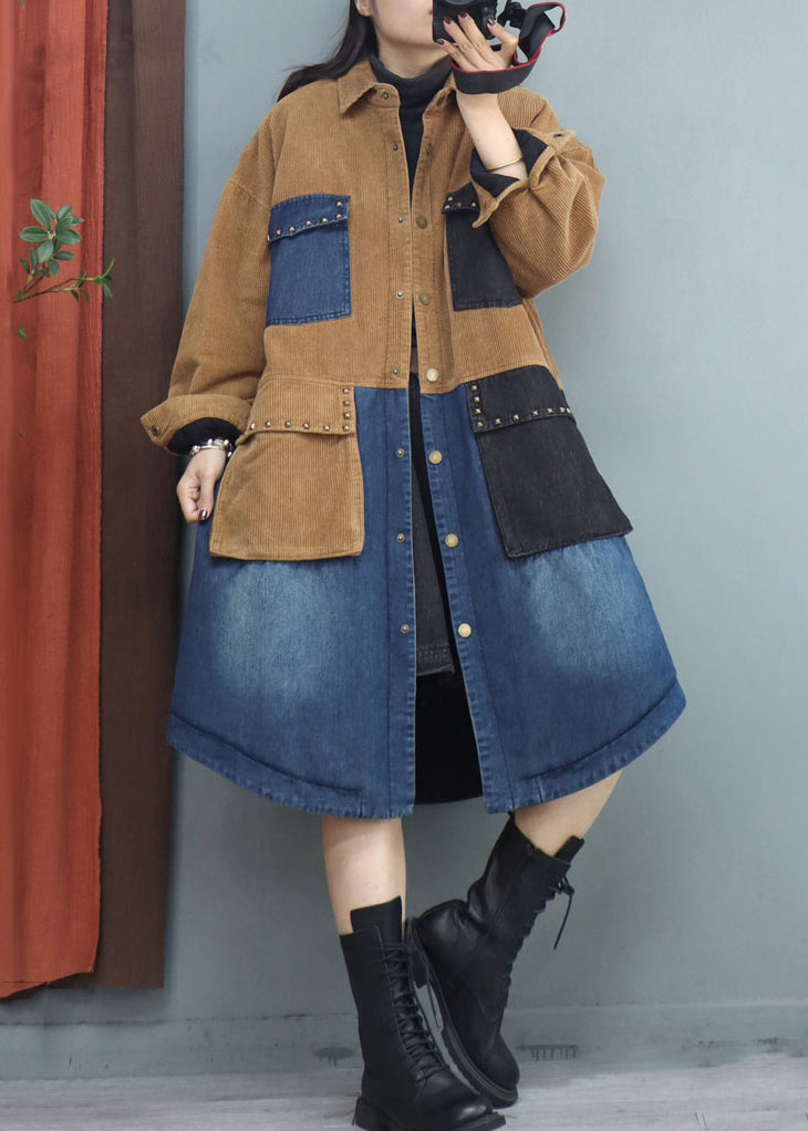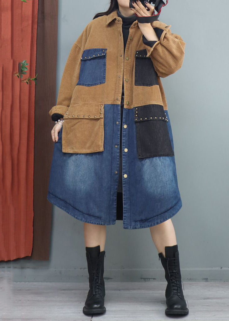Khaki Button Denim Patchwork Long Coats Rivet Long Sleeve