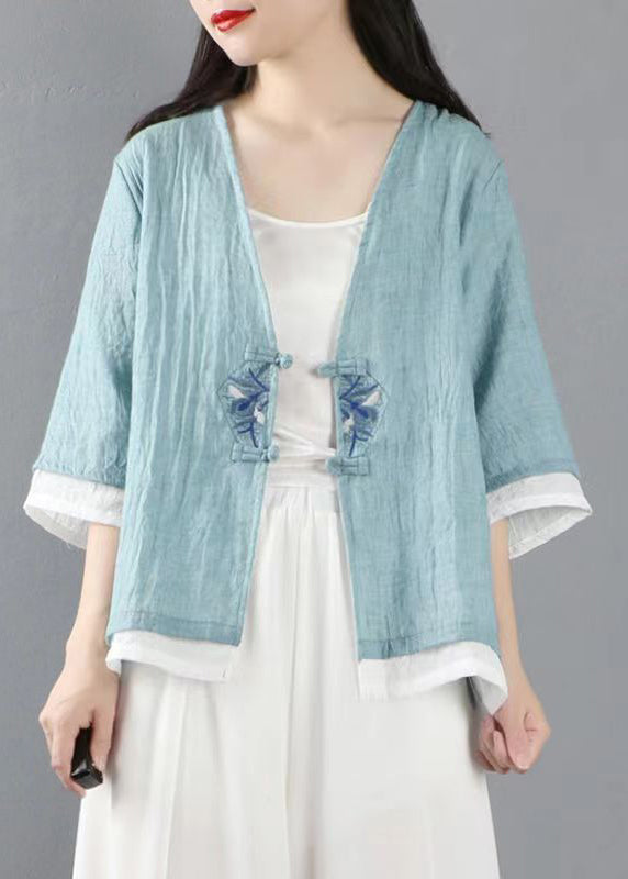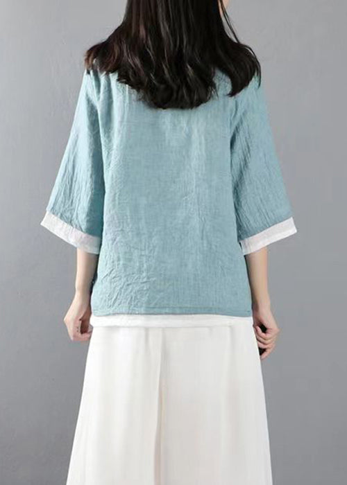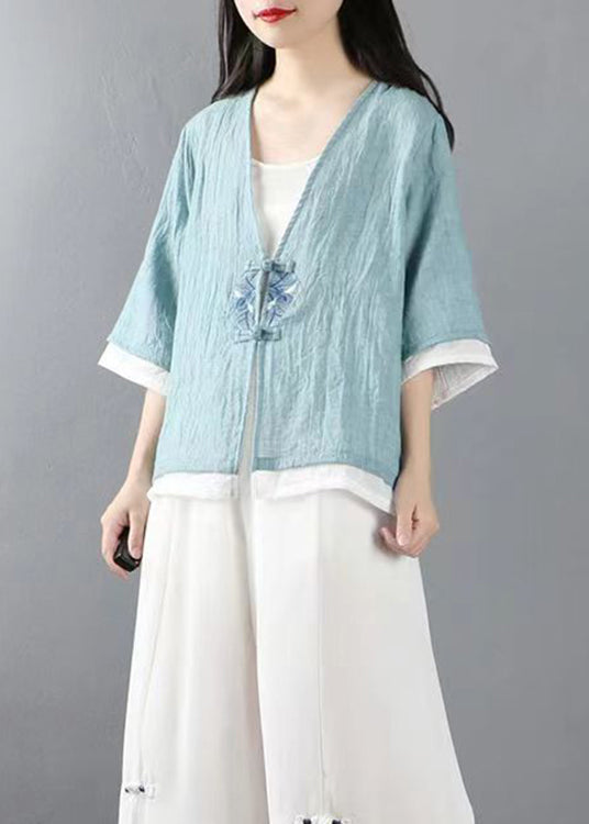 Light Blue Button Patchwork Linen Tops Coats V Neck Half Sleeve
