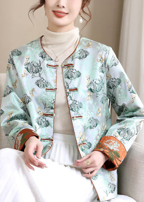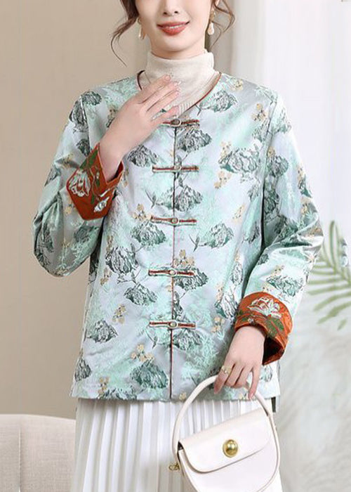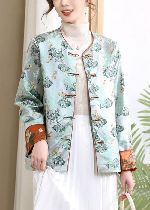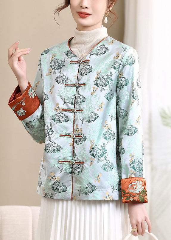 Loose Blue V Neck Button Print Silk Coats Spring