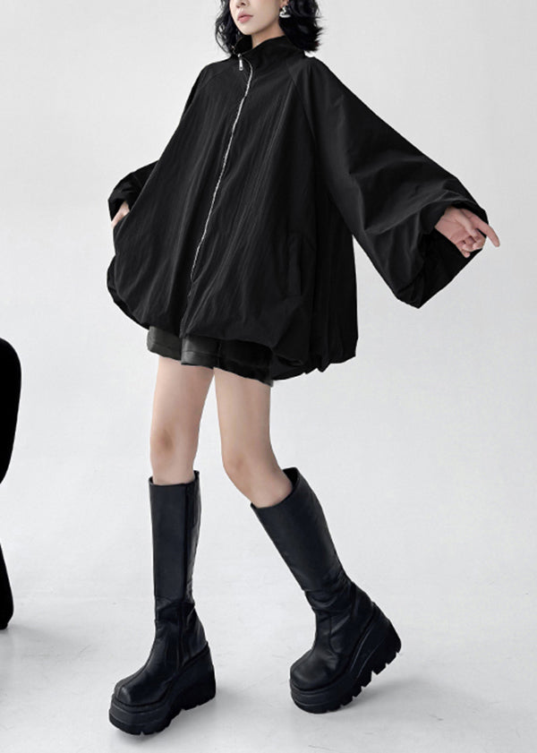 Modern Black Stand Collar Zip Up Pockets Cotton Jackets Fall