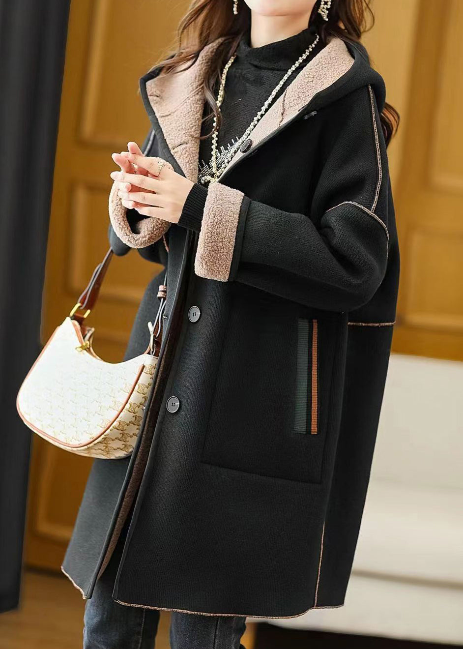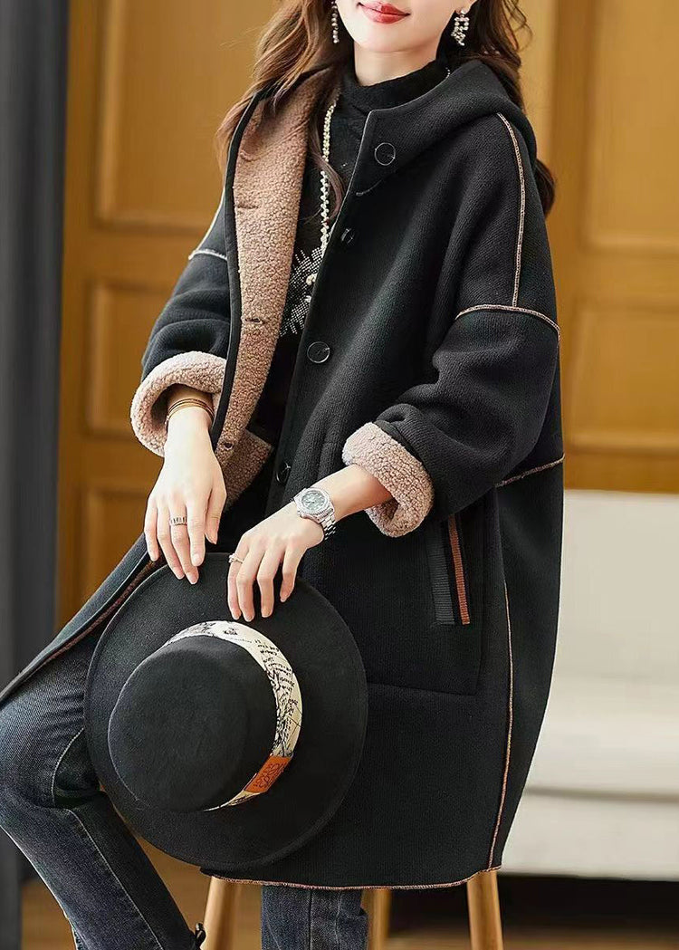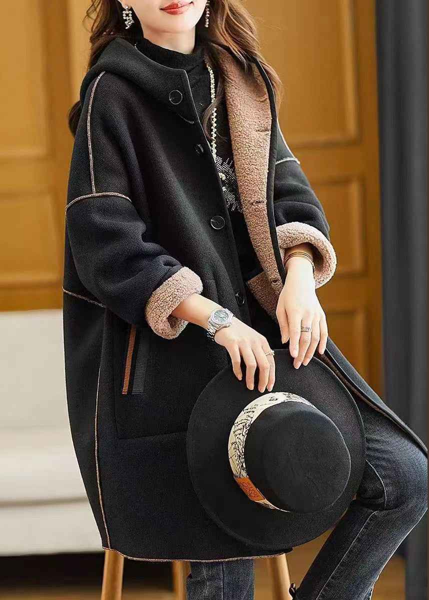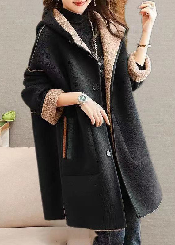 Plus Size Black Hooded Pockets Patchwork Woolen Coat Winter