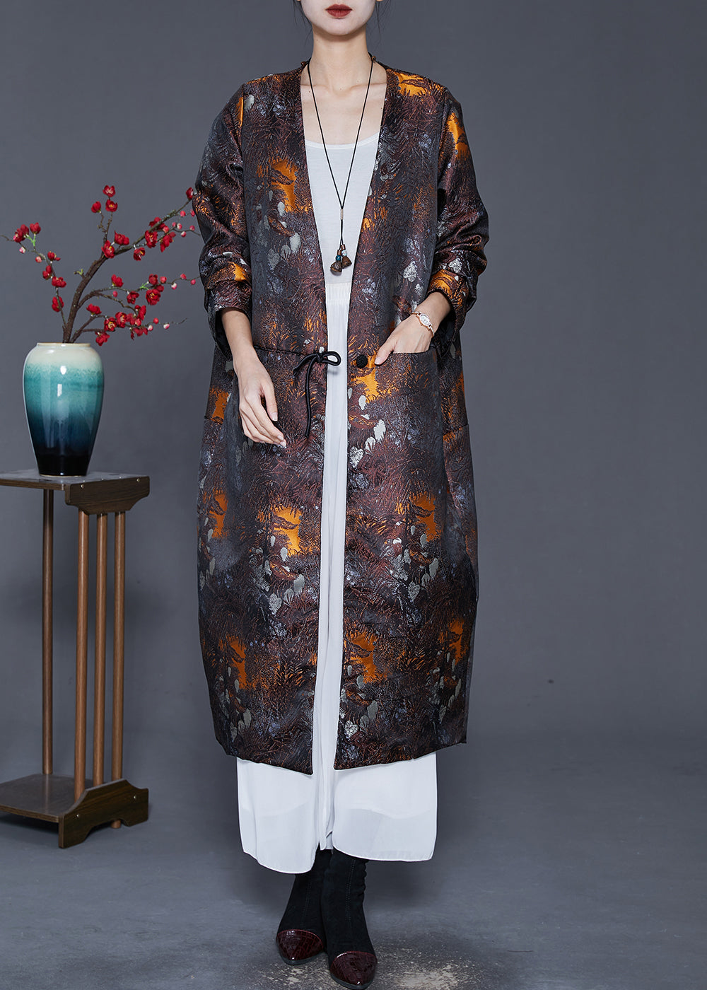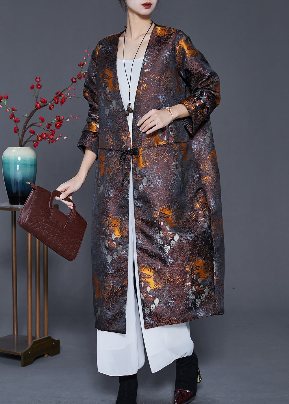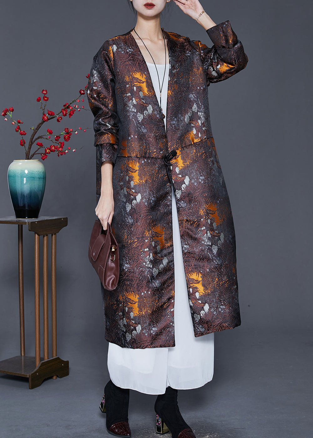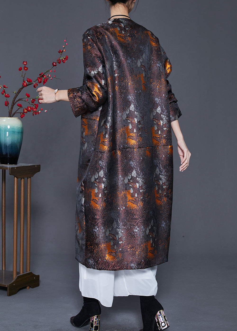 Plus Size Brown Oversized Print Cotton Filled Silk Coat Outwear Spring