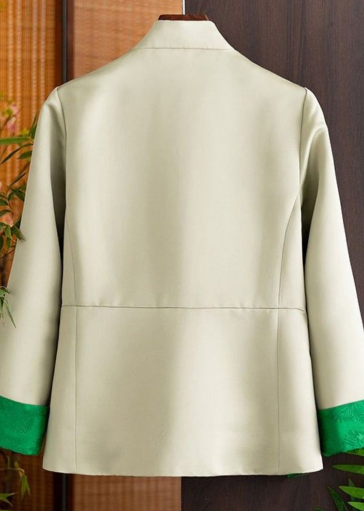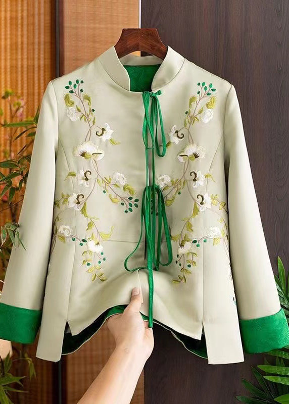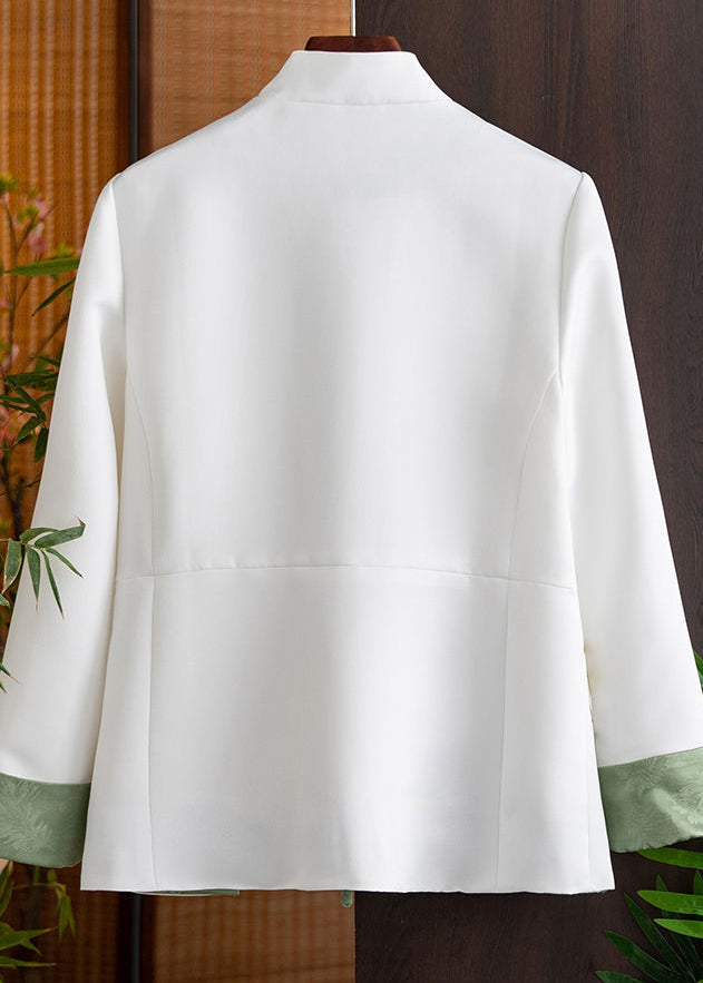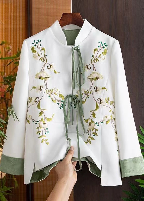 Retro White Stand Collar Embroidered Lace Up Patchwork Cotton Coats Fall