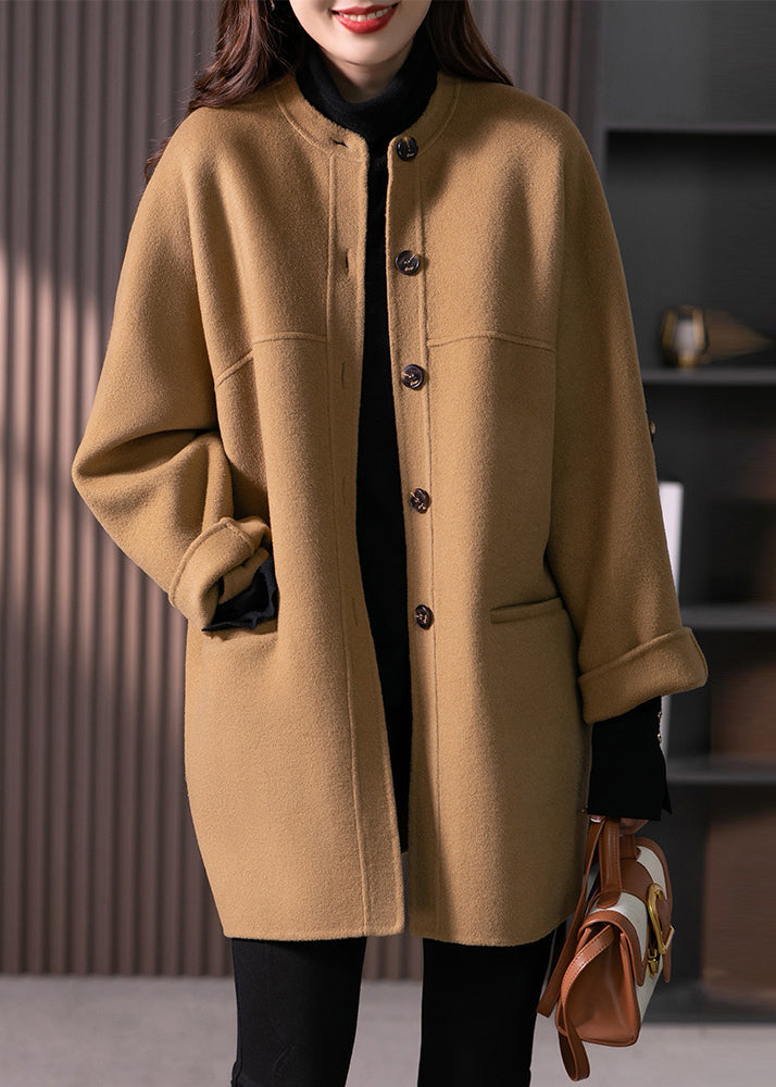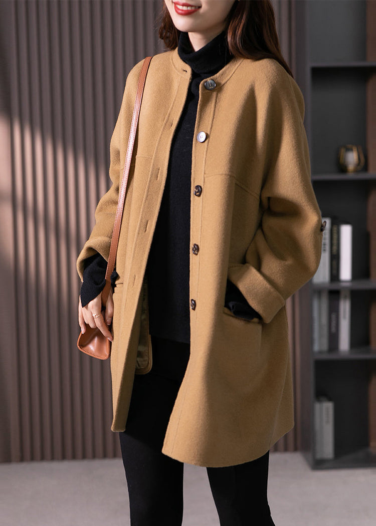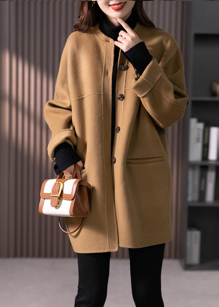 Women Camel O Neck Pockets Button Patchwork Wool Coats Fall