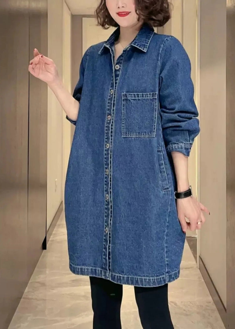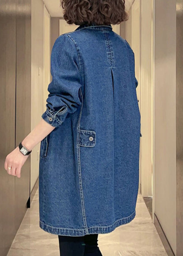 Women Denim Blue Pockets Patchwork Button Coat Fall