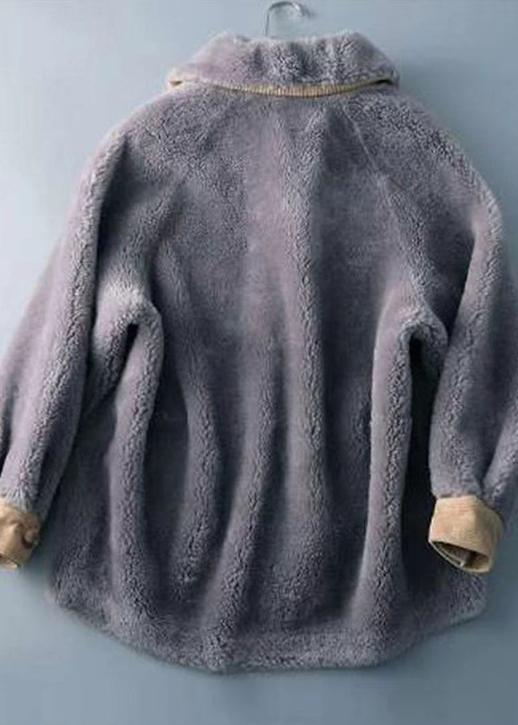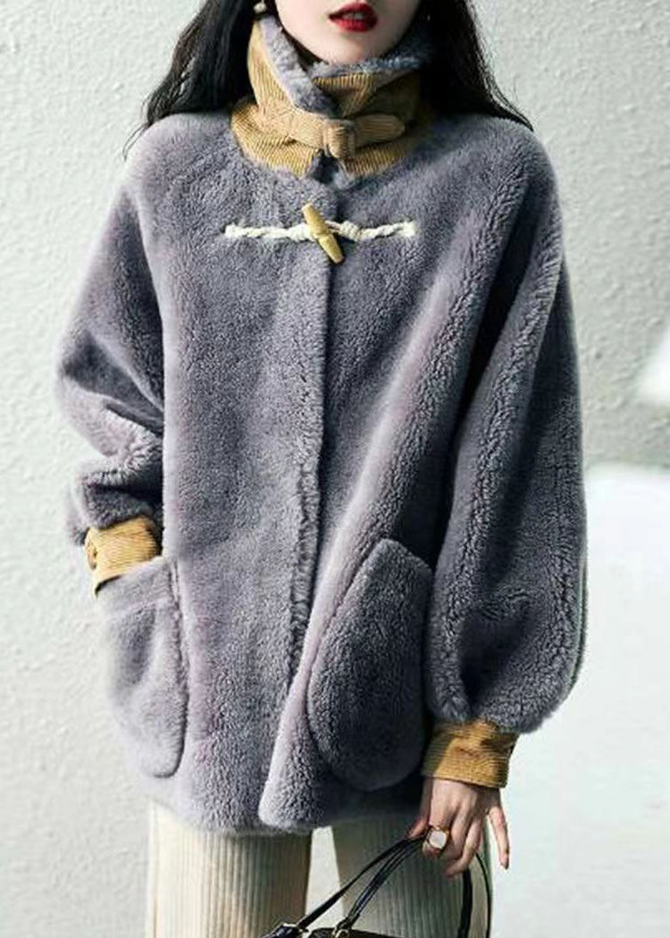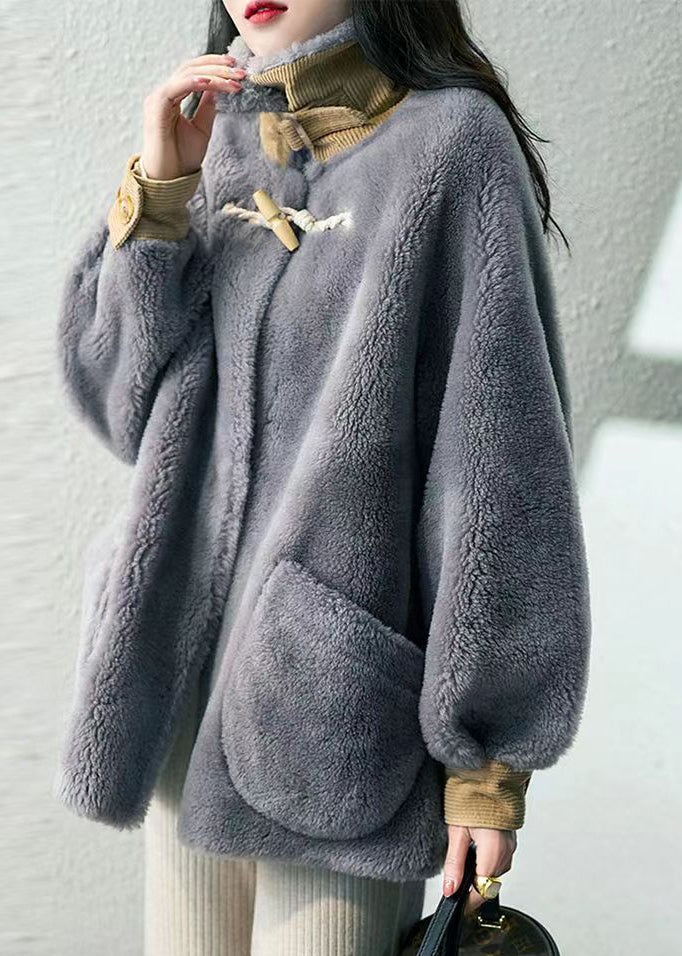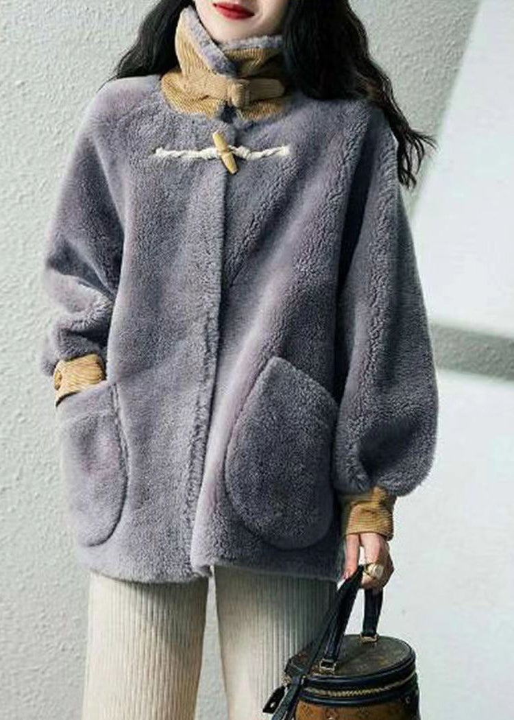 Women Grey Hign Neck Pockets Patchwork Wool Coats Winter