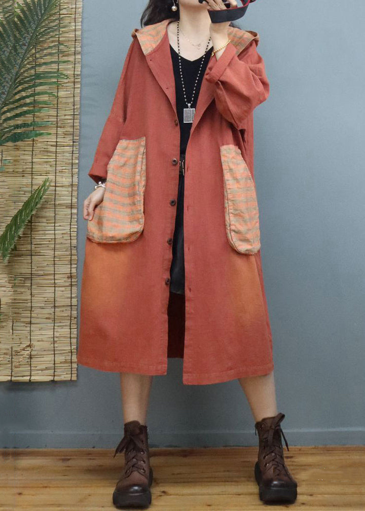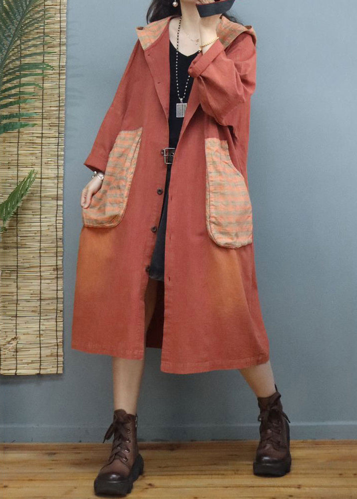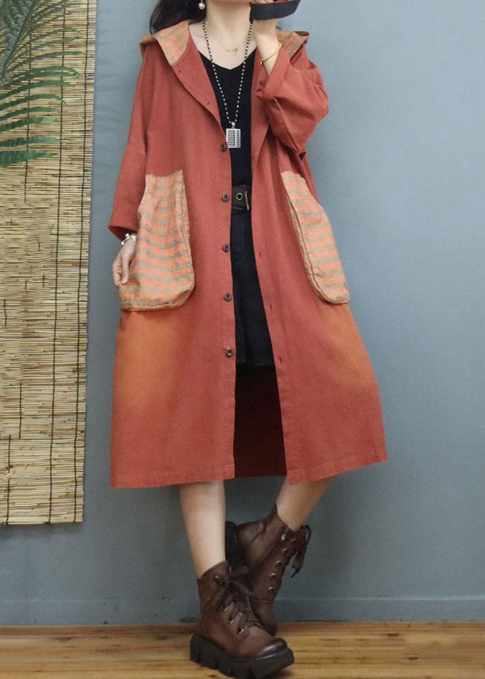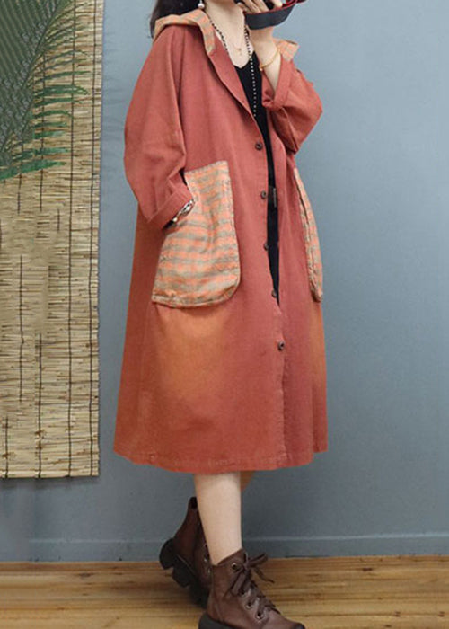 Women Orange Hooded Pockets Patchwork Cotton Coats Fall