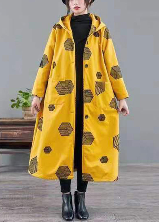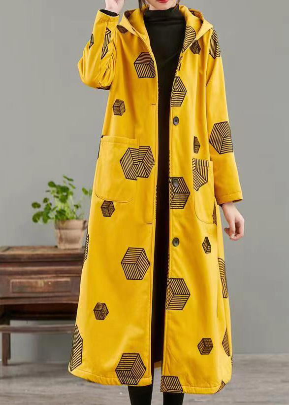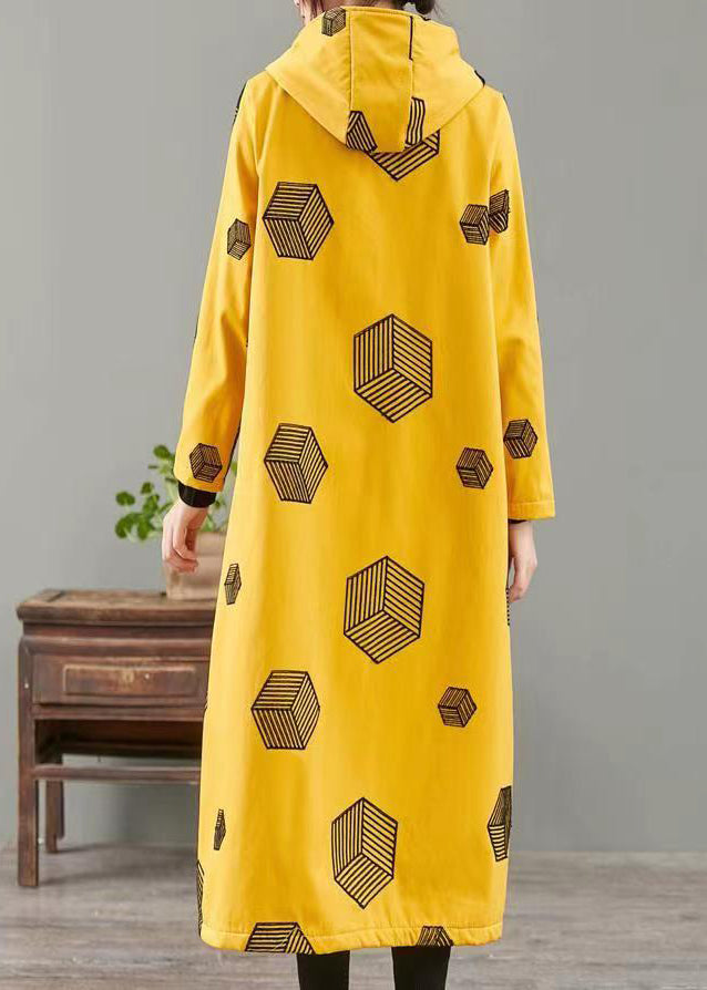 Women Yellow Hooded Pockets Print Warm Fleece Coat Winter