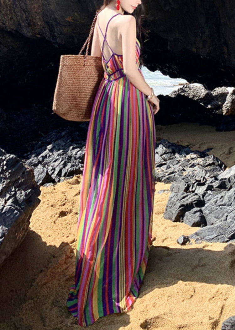 Beach Striped V Neck Backless Cotton Spaghetti Strap Dress Sleeveless