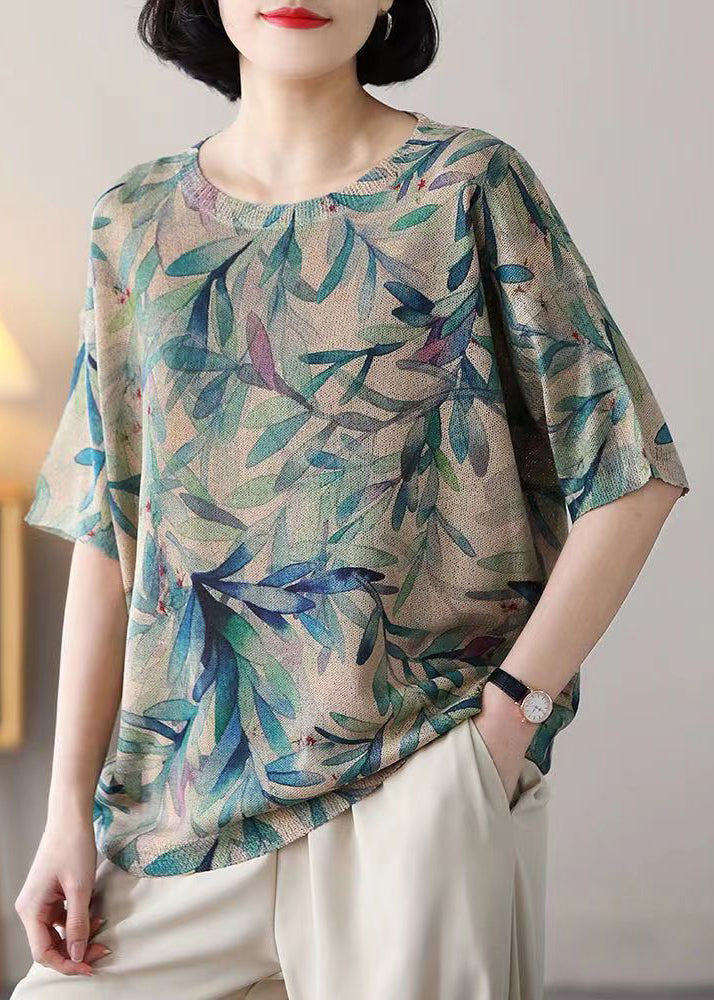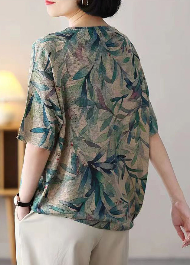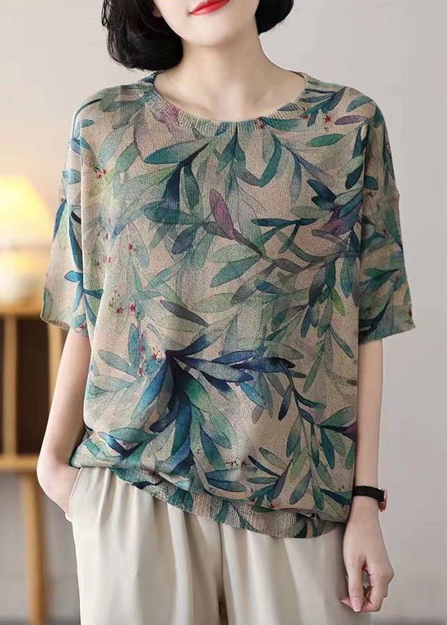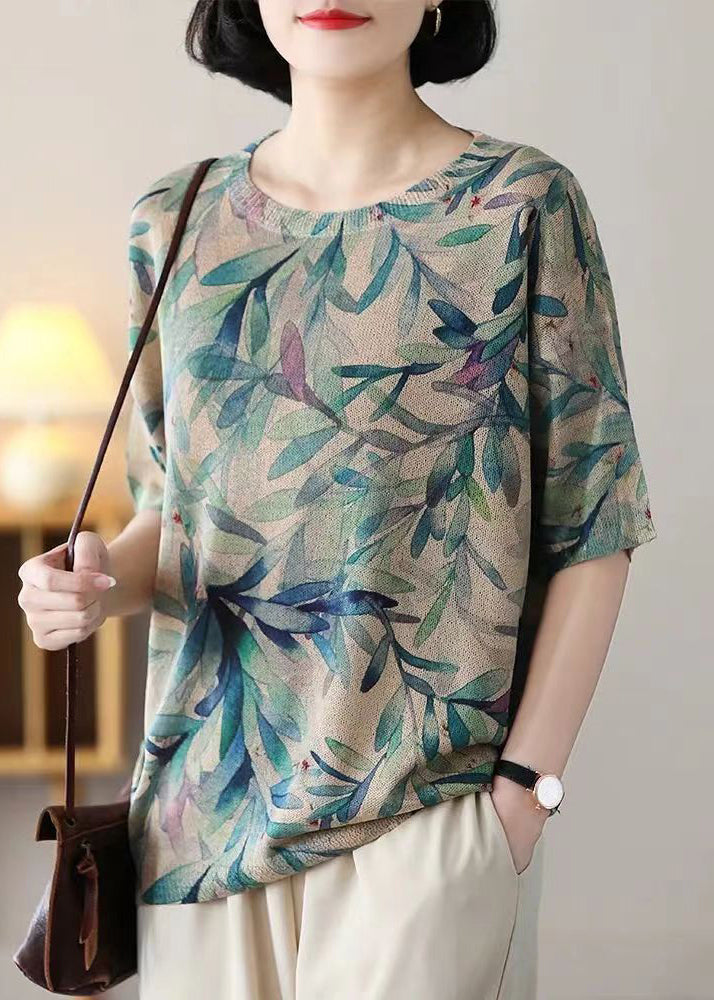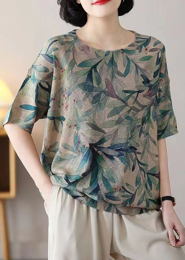 Loose Green Print Patchwork Cozy Cotton Knit T Shirt Summer