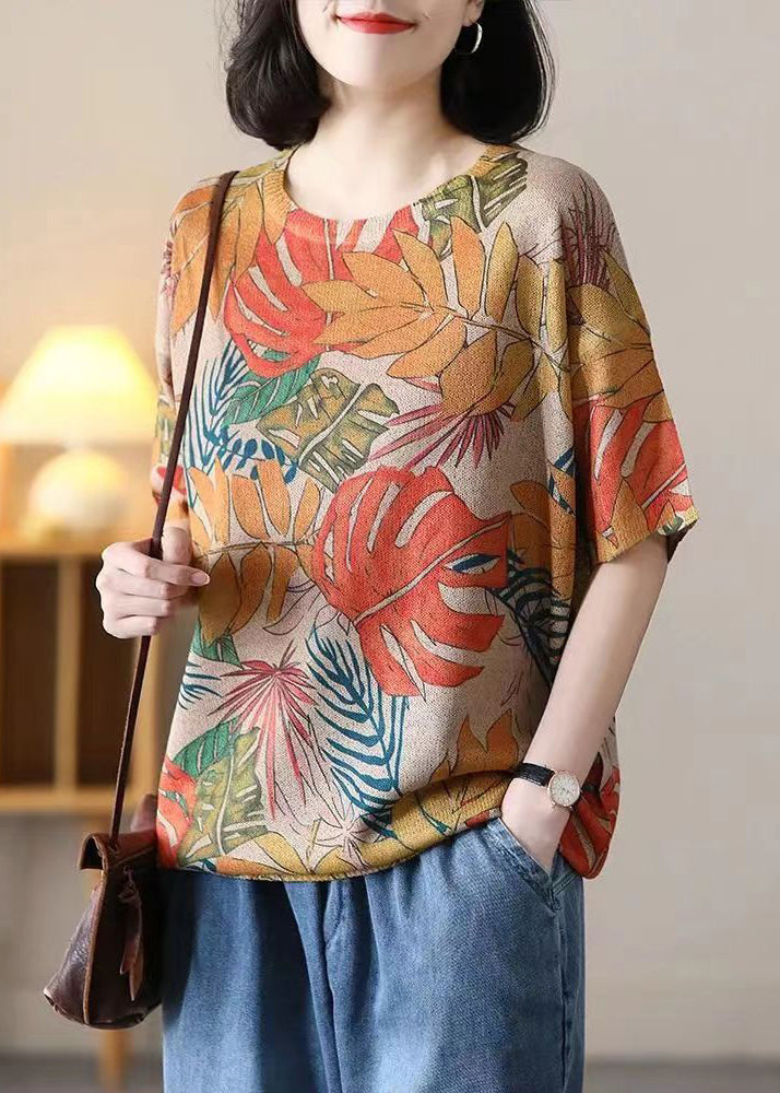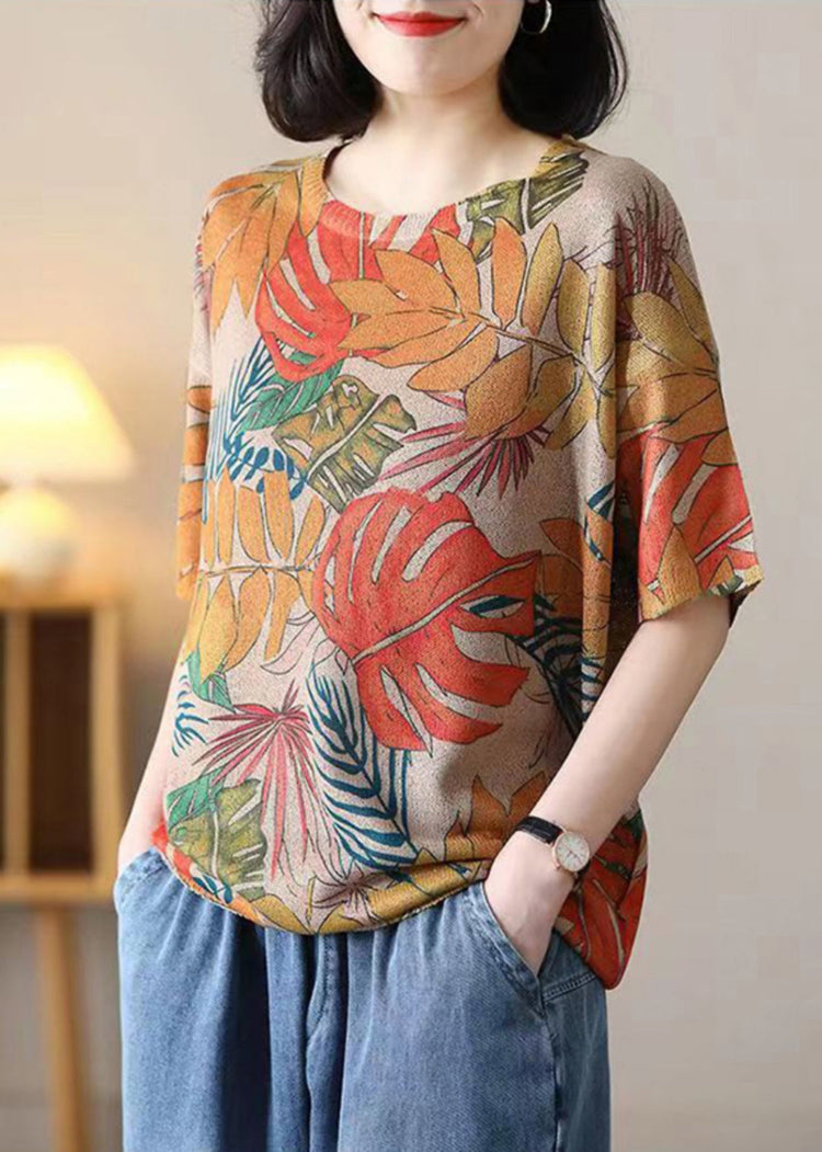 Loose Orange O Neck Print Cotton Knit T Shirt Summer
