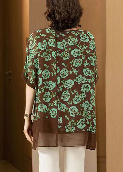 Women Green O Neck Print Patchwork Chiffon T Shirt Summer