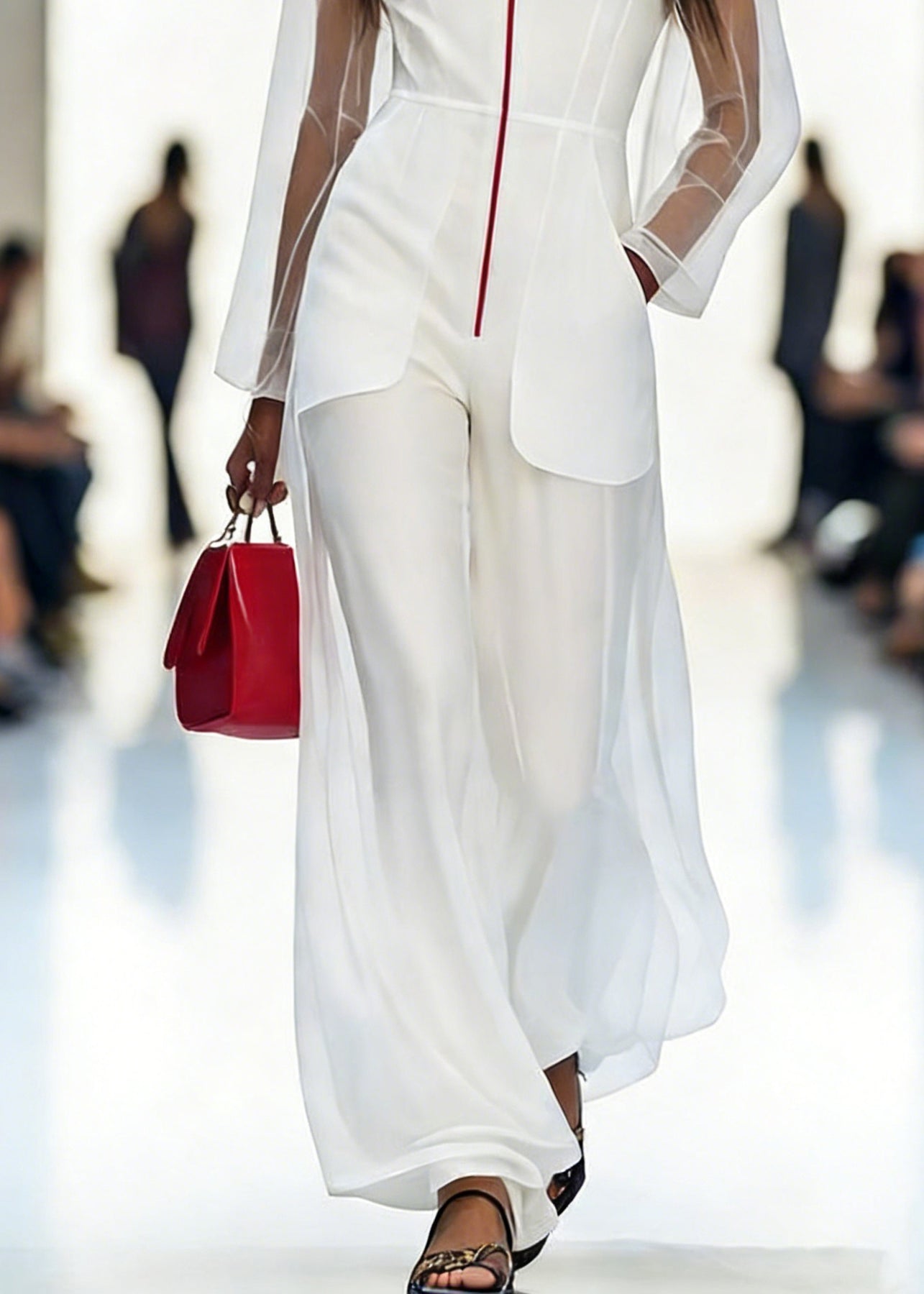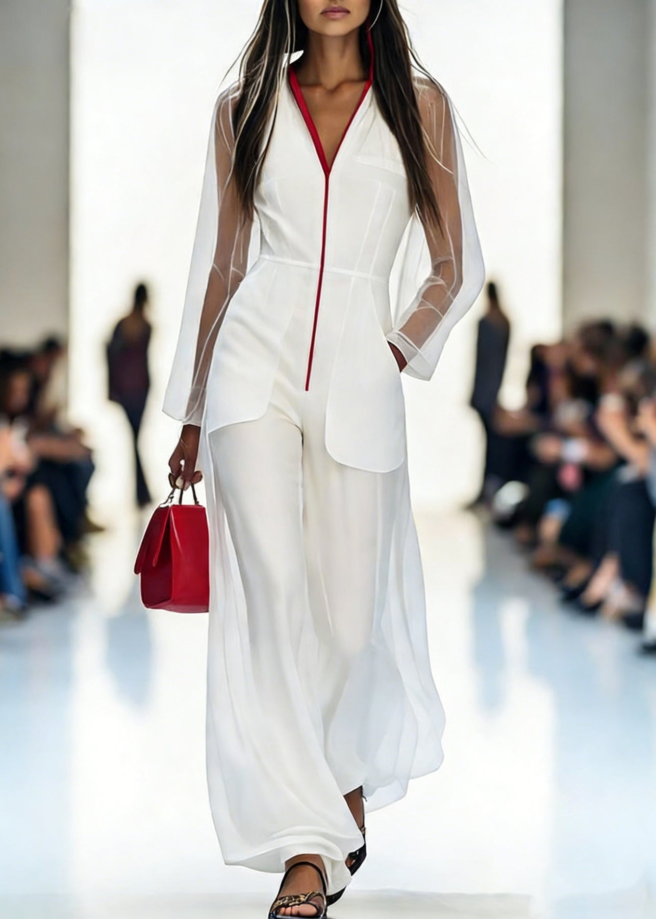 Italian White V Neck Pockets Tulle Jumpsuits Pants Spring