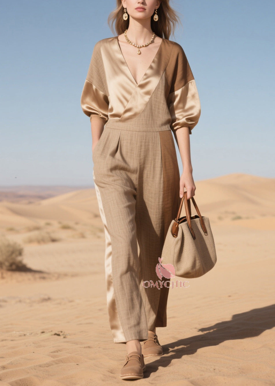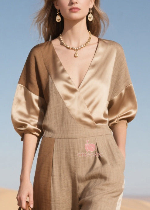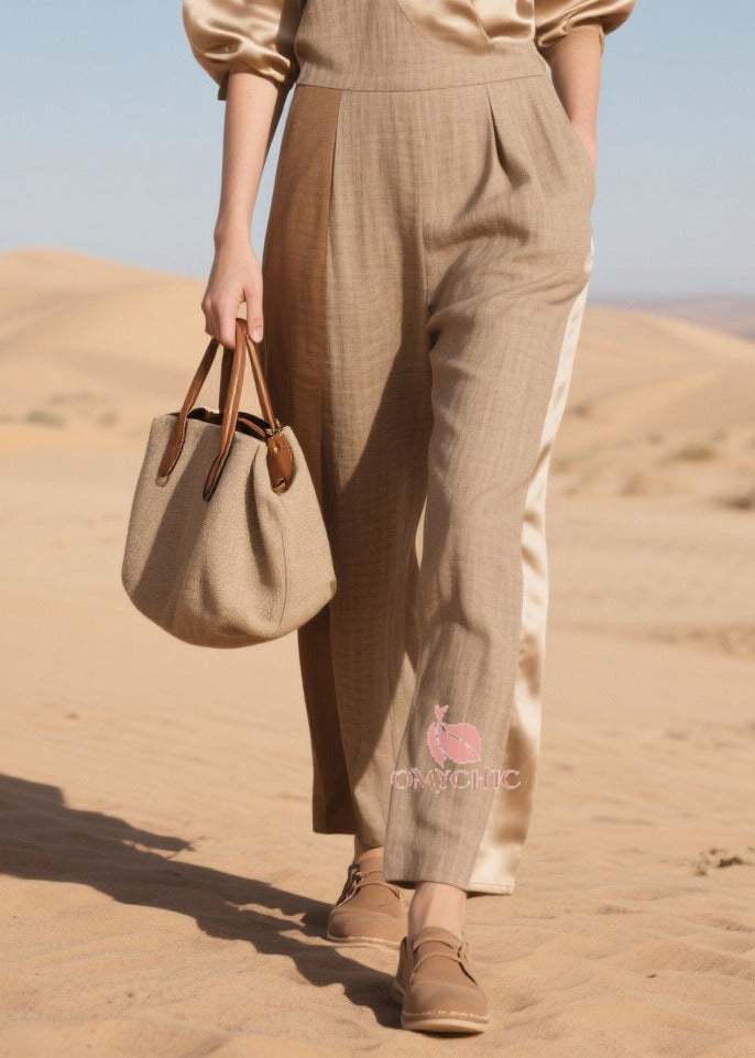 Simple Khaki Asymmetrical Patchwork Linen Silk Jumpsuit Summer