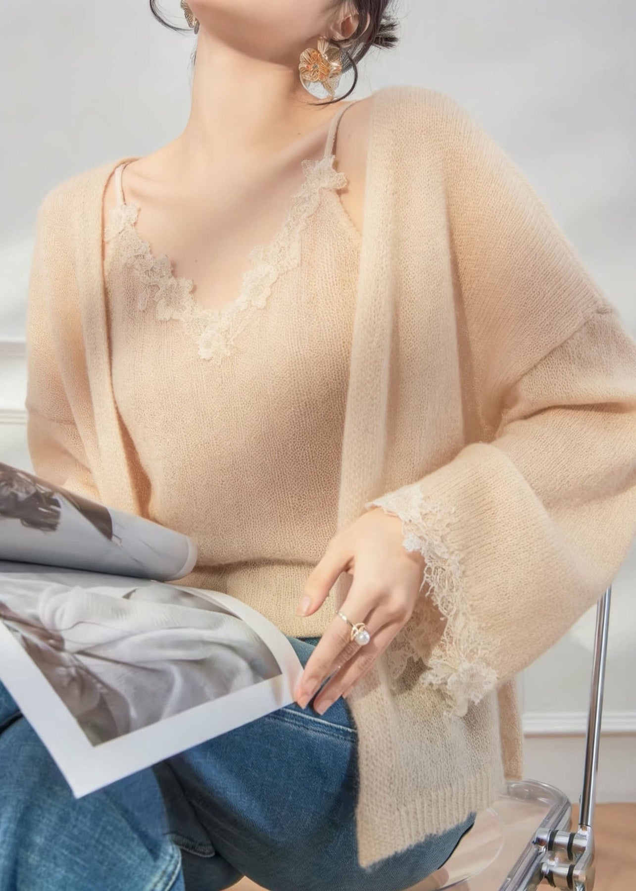 French V Neck Lace Patchwork Knit Two Pieces Set Spring