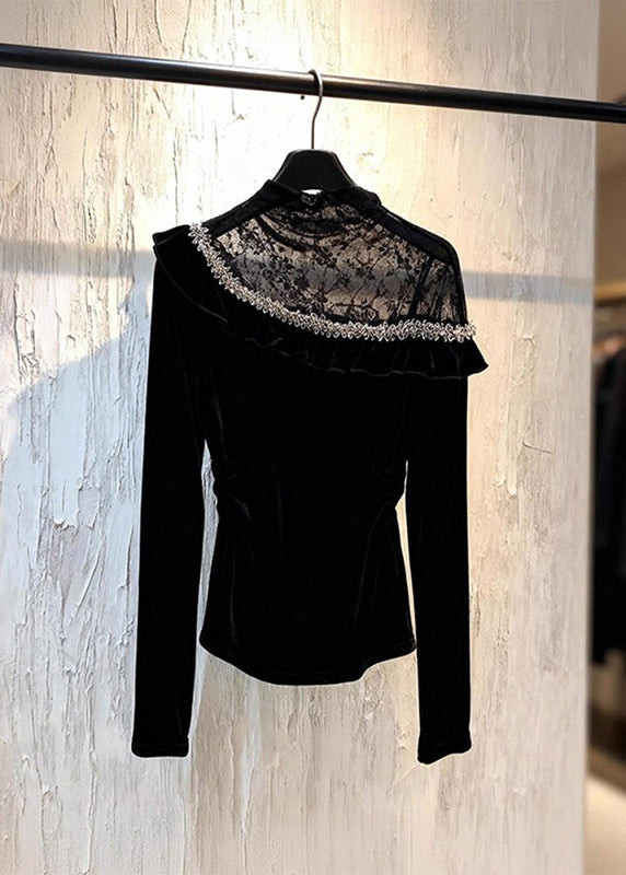Sexy Black Lace Patchwork Silk Velour Top Spring