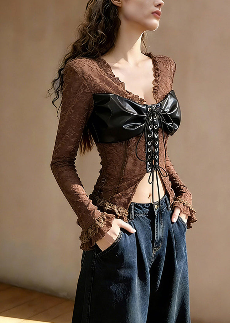 Sexy Coffee Ruffled Lace Up Patchwork Lace T Shirt Tops Spring