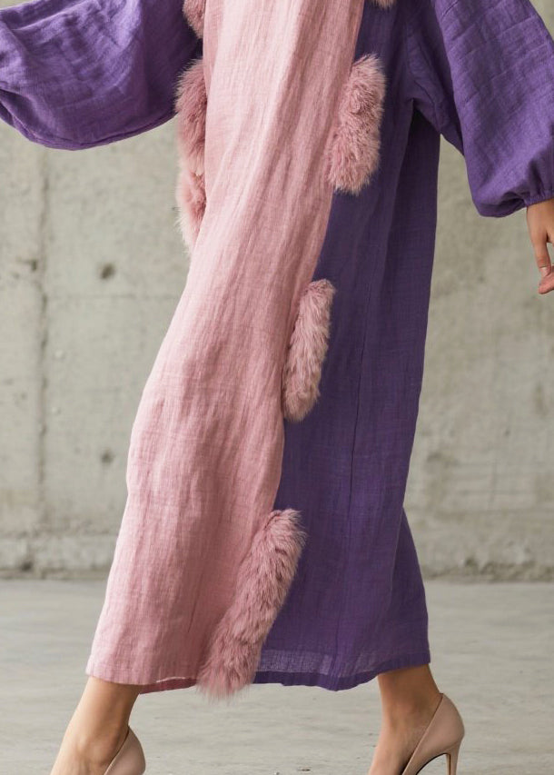 Chic Pink Oversized Patchwork Faux Fur Cotton Party Dress Lantern Sleeve