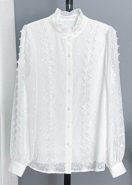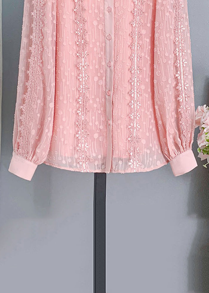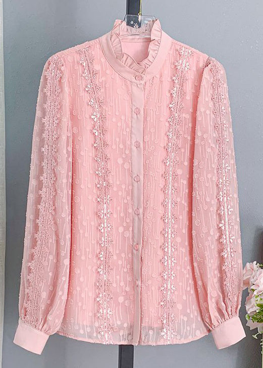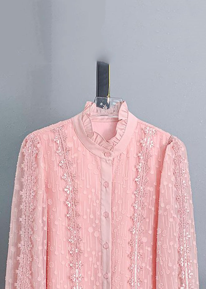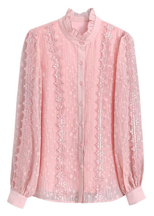 Chic Pink Ruffled Button Lace Shirt Long Sleeve