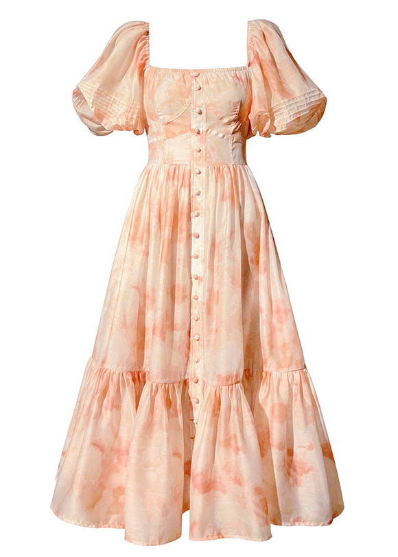 Elegant Pink Square Collar Patchwork Print Silk Dress Puff Sleeve