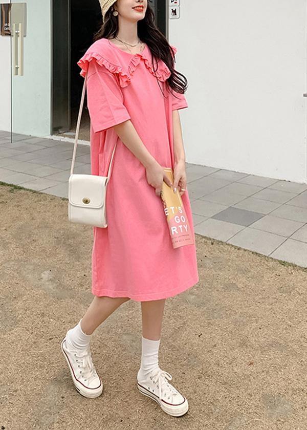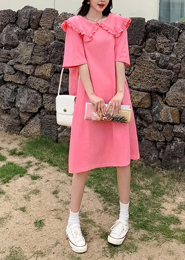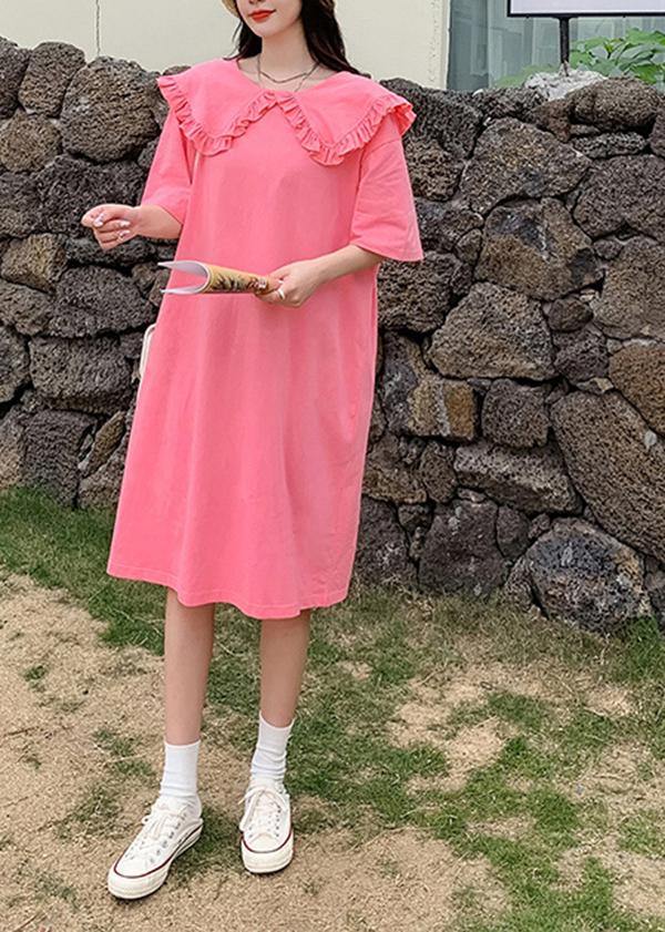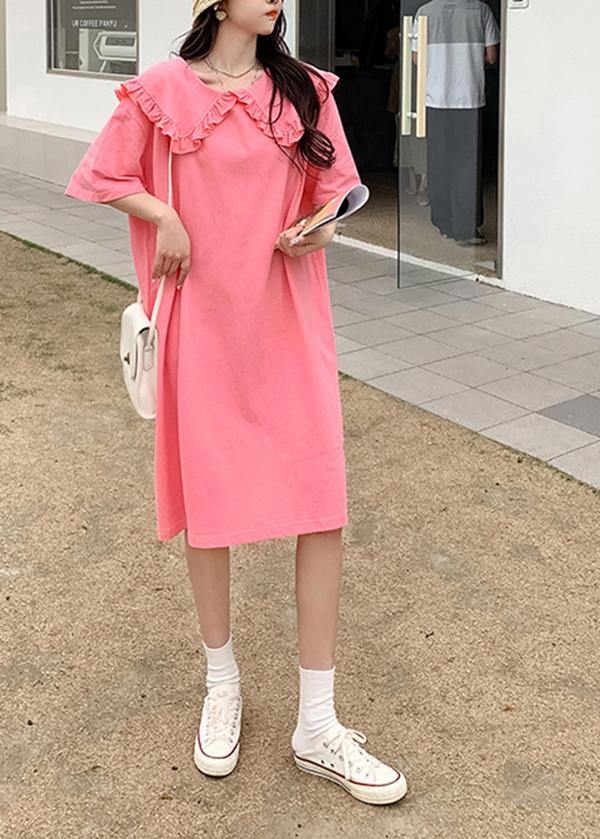 Fitted Pink Peter Pan Collar Loose Long Summer Cotton Dress