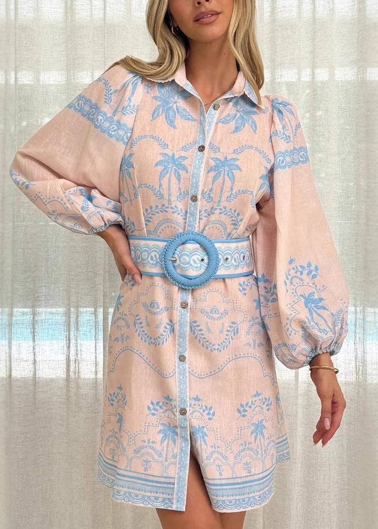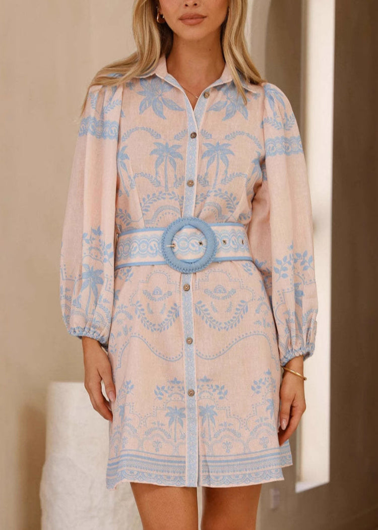 Fitted Pink Peter Pan Collar Print Sashes Cotton Mid Dress Summer