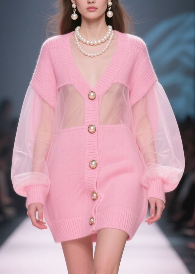 Italian Pink V Neck Tulle Button Patchwork Knit Cardigan Fall