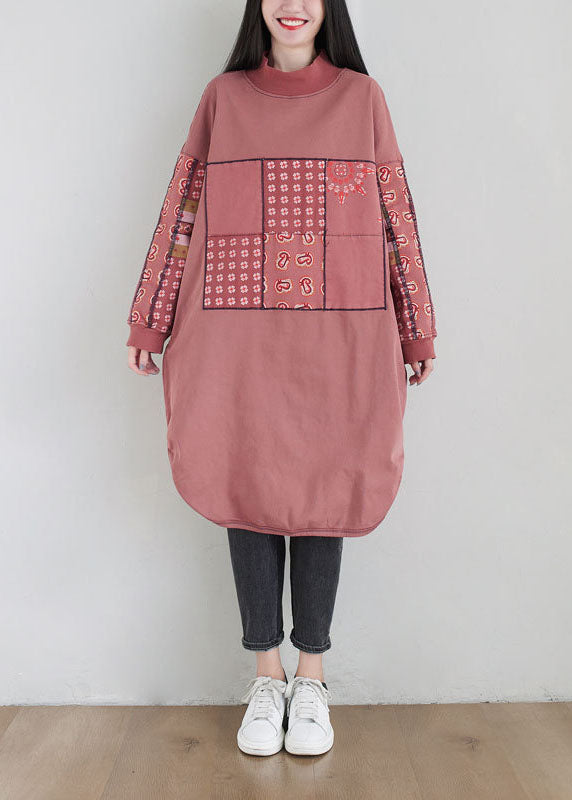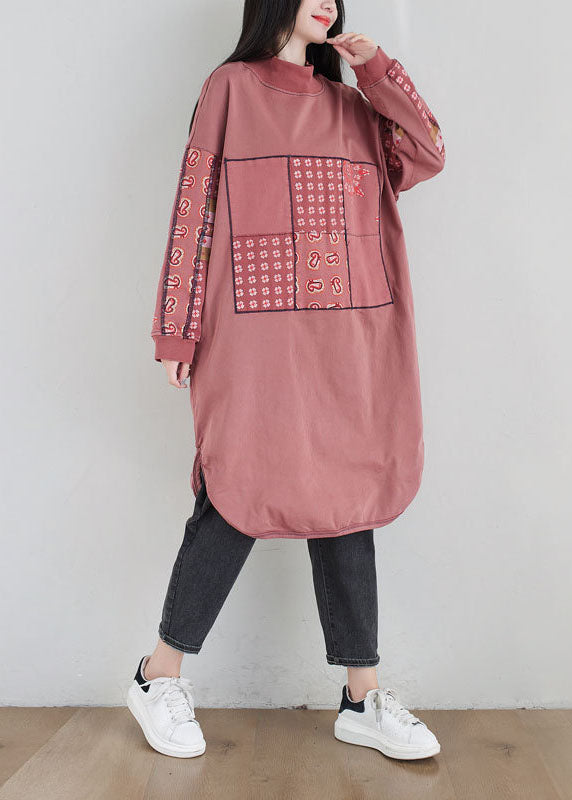 Plus Size Pink Stand Collar Print Cotton Loose Sweatshirt Dress Spring