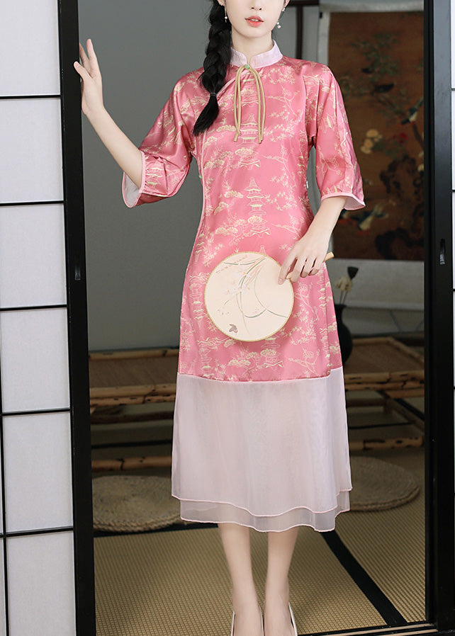 Slim Fit Pink Stand Collar Print Patchwork Silk Maxi Dresses Spring