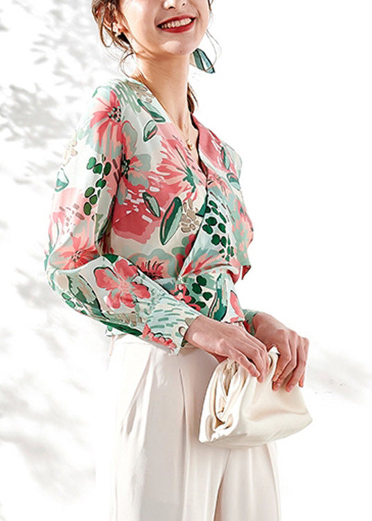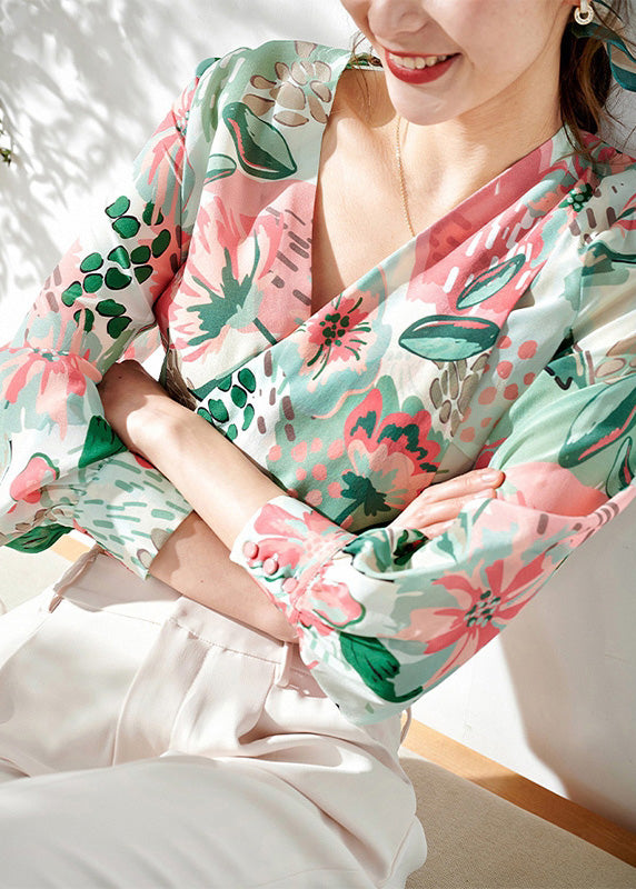 Style Pink Green V Neck Print Silk Shirts Long Sleeve