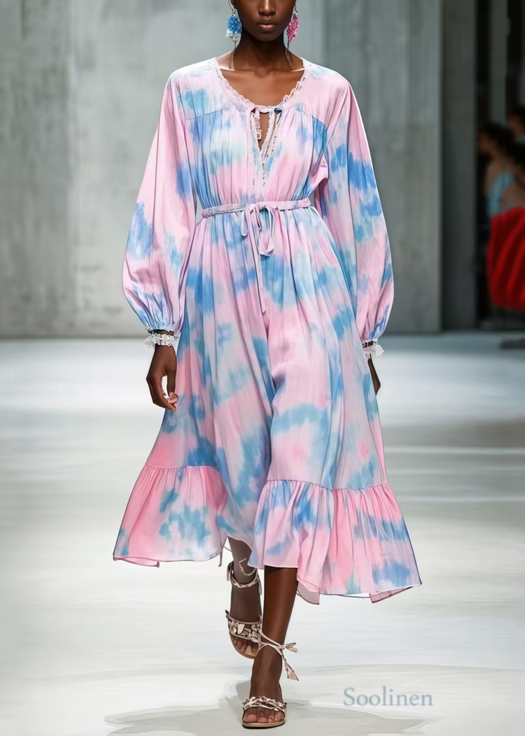 Unique Pink Cinched Tie Dye Chiffon Long Dresses Spring