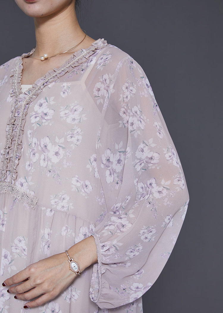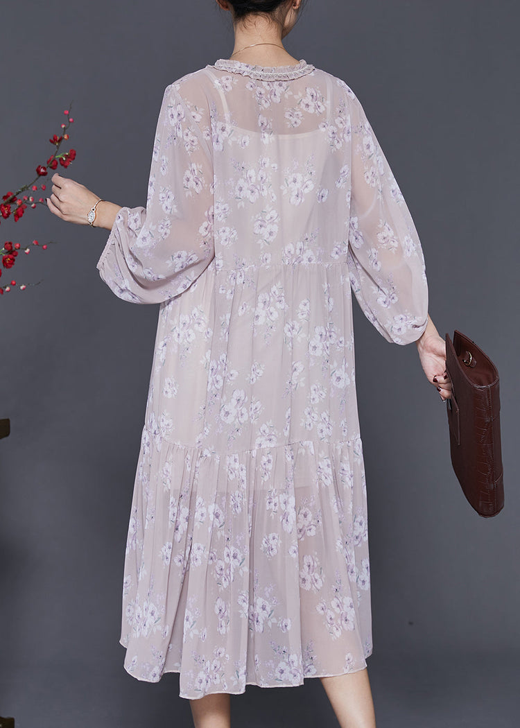 Unique Pink Ruffled Print Chiffon Maxi Dresses Bracelet Sleeve