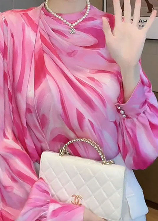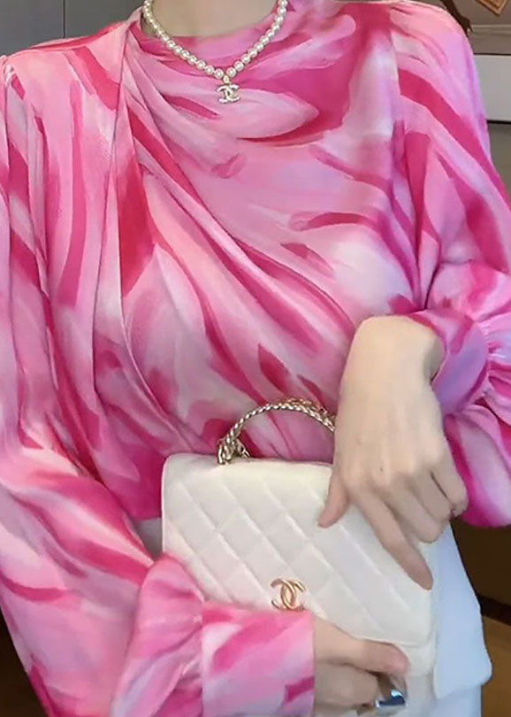Women Pink V Neck Wrinkled Patchwork Print Silk Shirts Top Spring