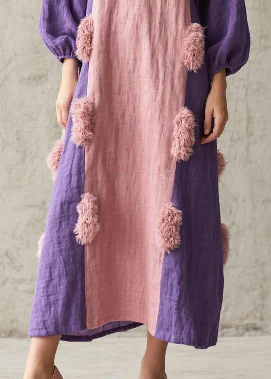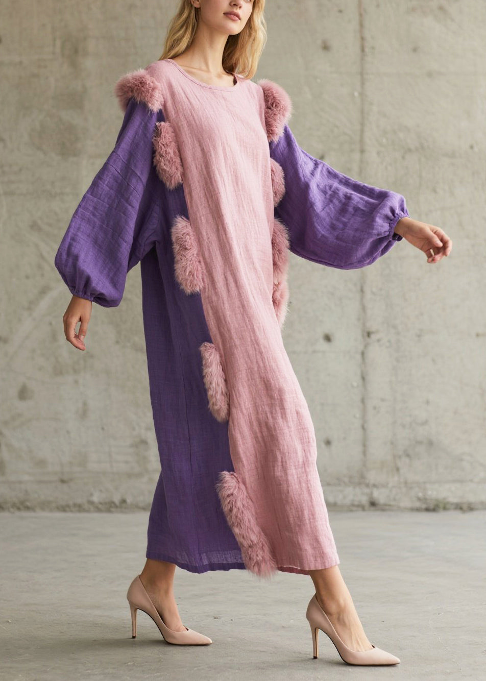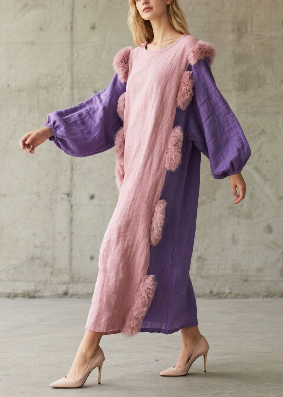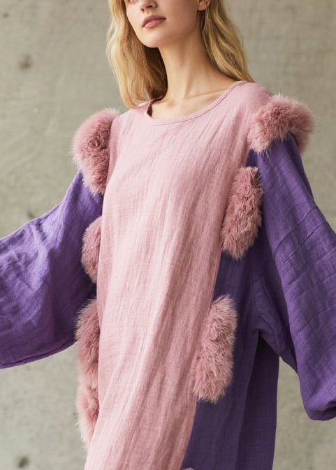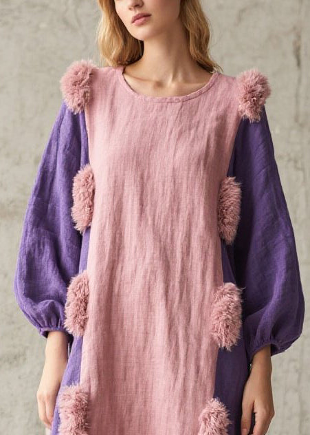 Chic Pink Oversized Patchwork Faux Fur Cotton Party Dress Lantern Sleeve