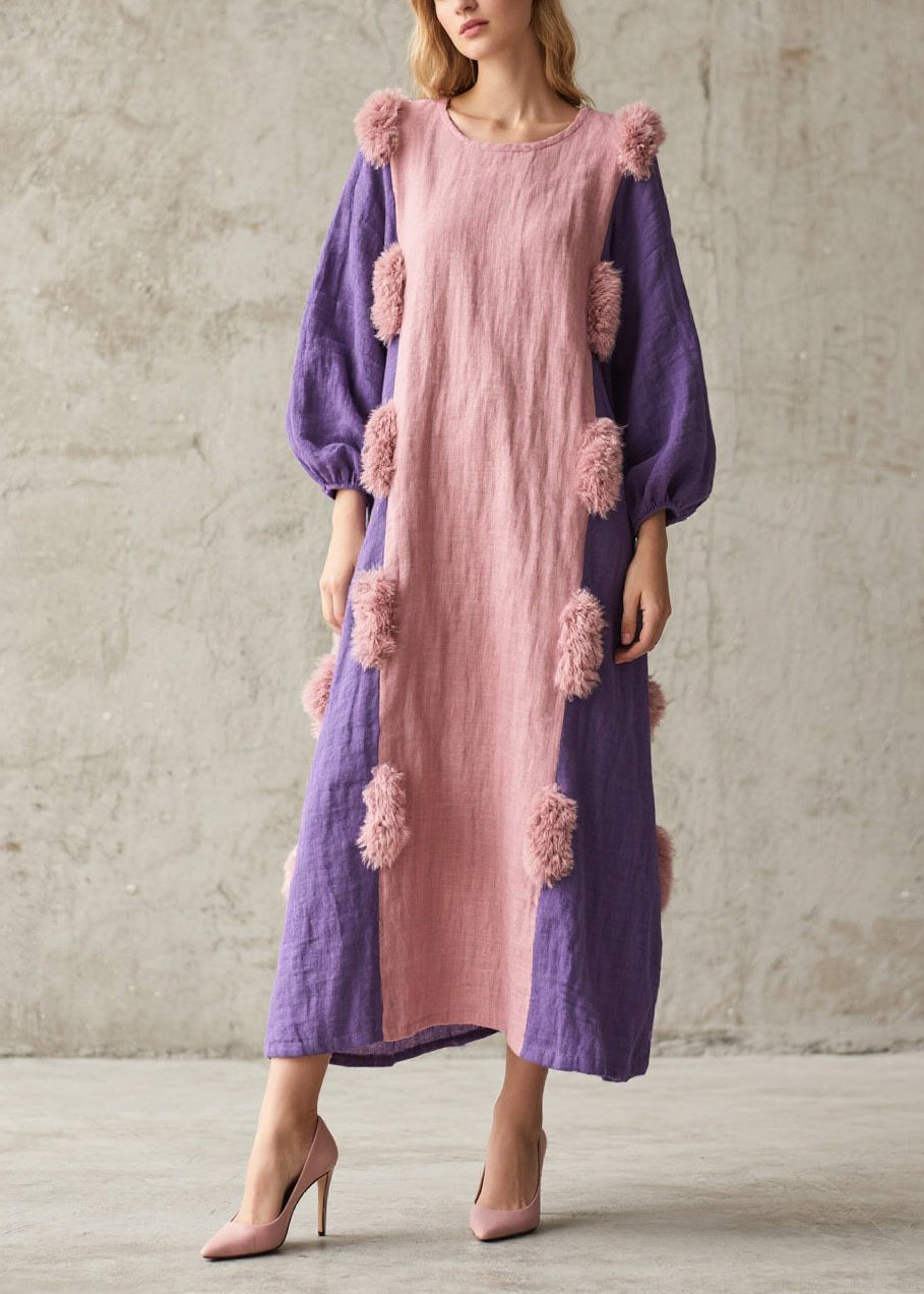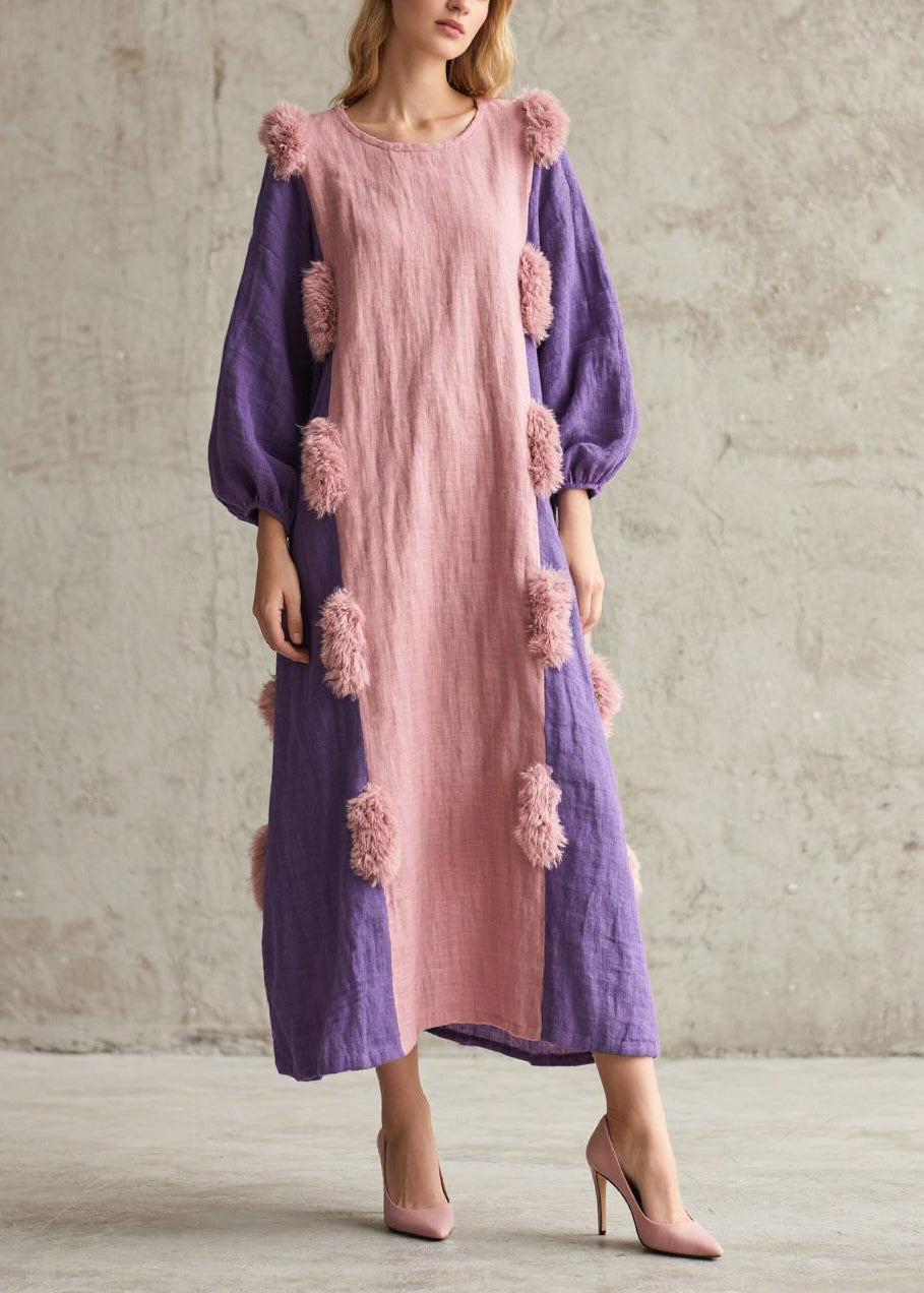 Elegant Pink Oversized Patchwork Cotton Robe Dresses Lantern Sleeve