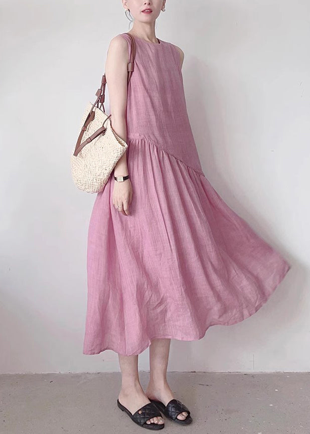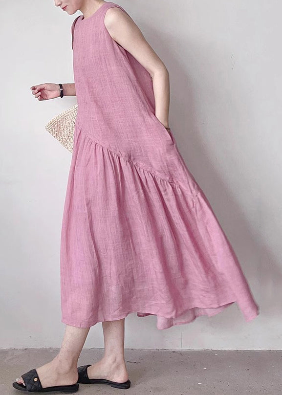 Simple Pink O Neck Pockets Wrinkled Cotton Long Dress Sleeveless