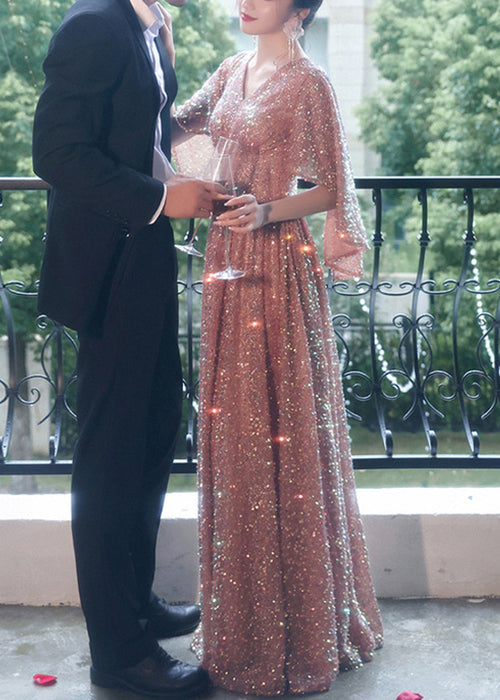 Dinner Pink V Neck High Waist Sequins Cotton Party Dress