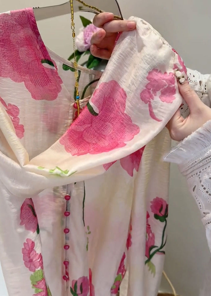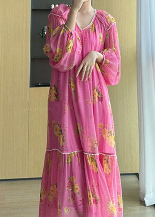 Elegant Pink V Neck Print Patchwork Chiffon Long Dresses Fall