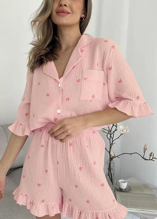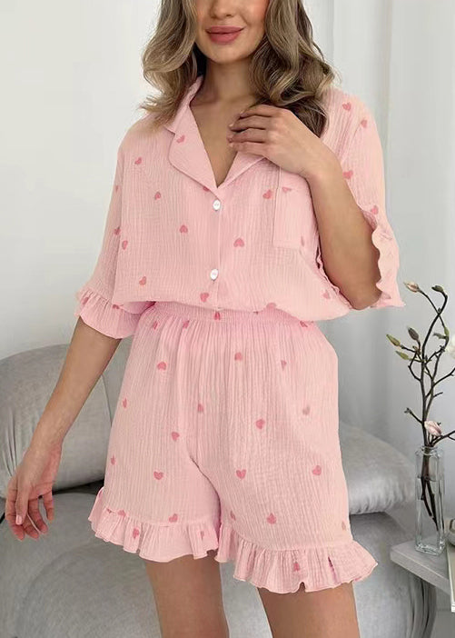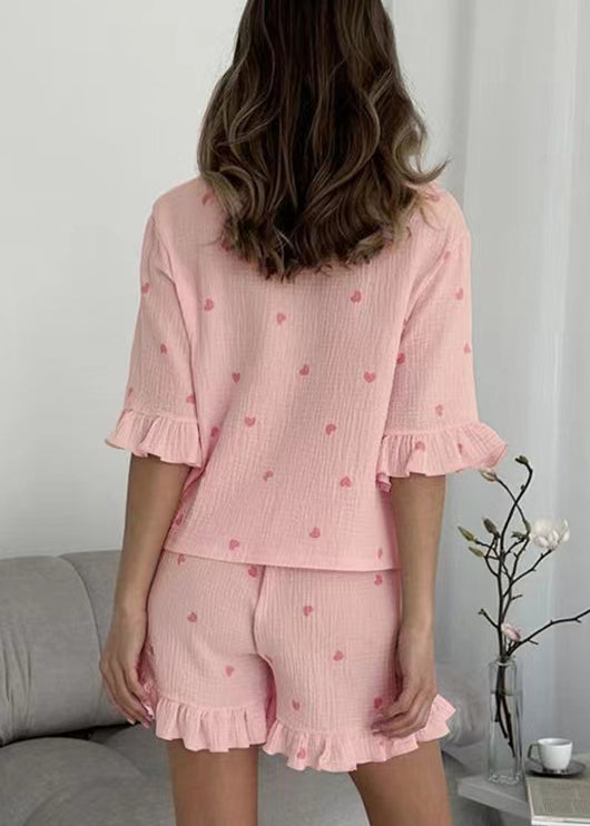 Fitted Pink Ruffled Love Print Cotton Women Pajama Sets 2 Pieces Summer